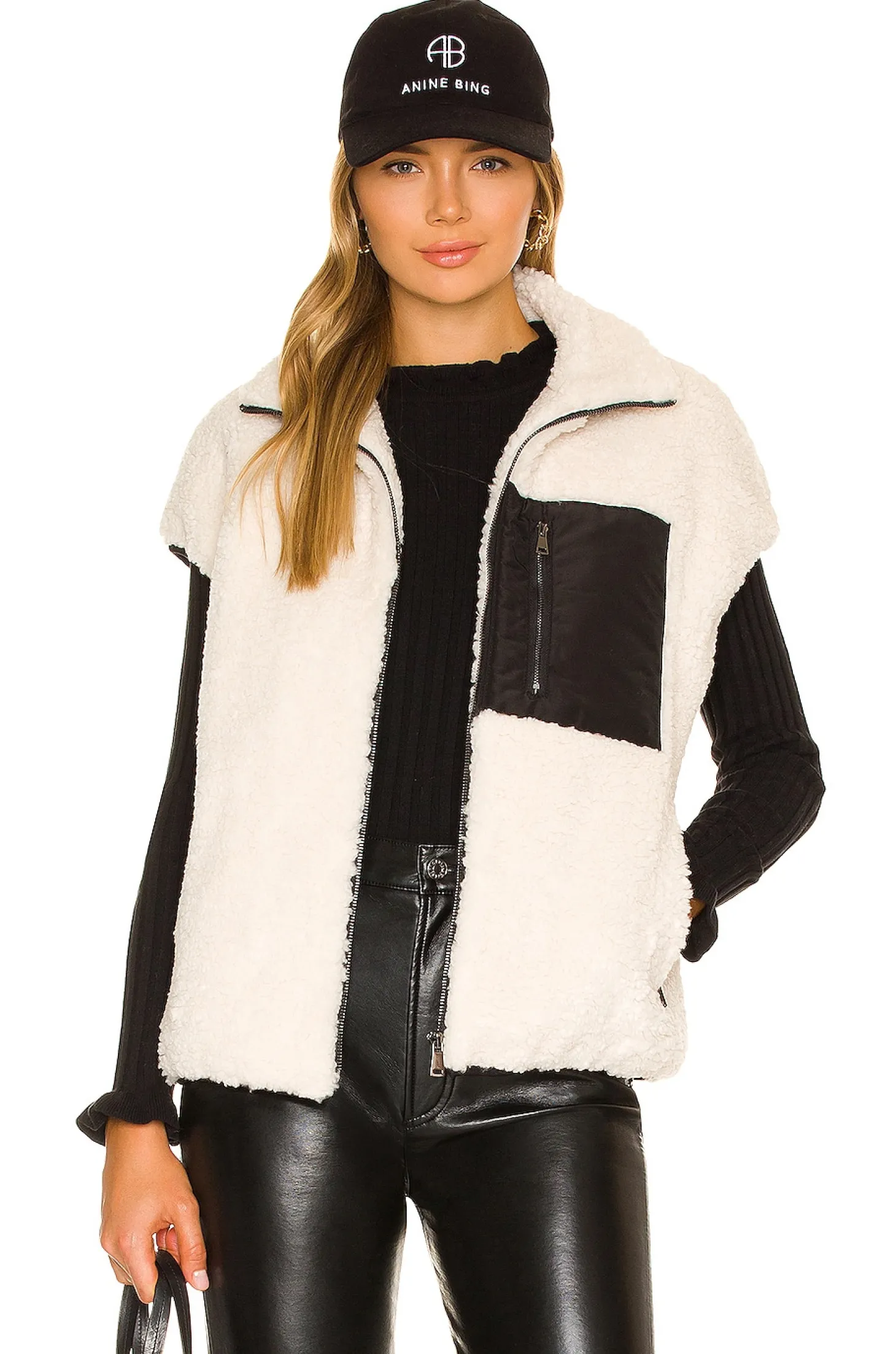 100% poly.Made in China.Dry clean only.Front zipper closure.Front pockets with zipper closure.Contrast ripstop pocket.Faux fur fabric.Please note: shirt not included