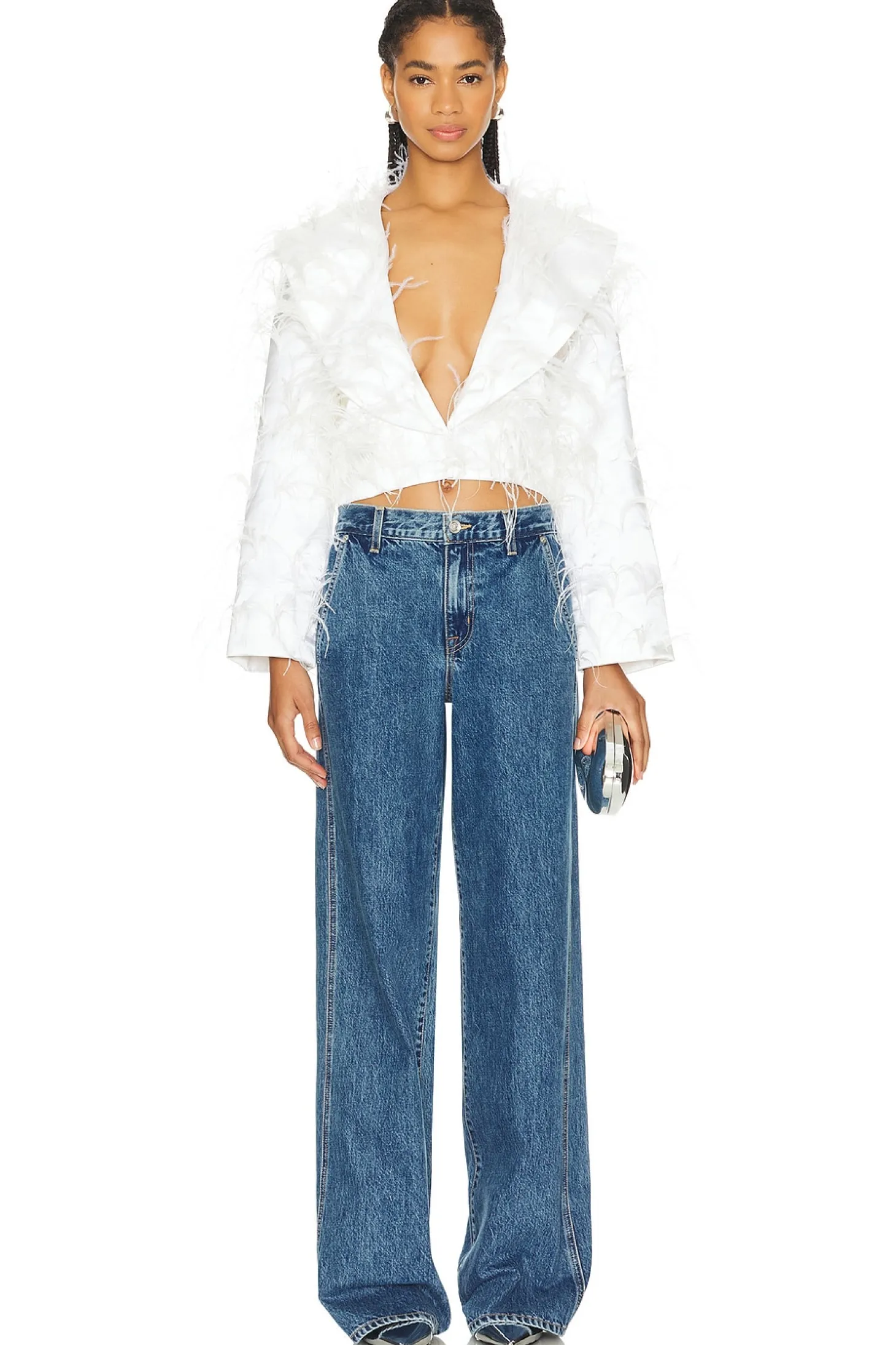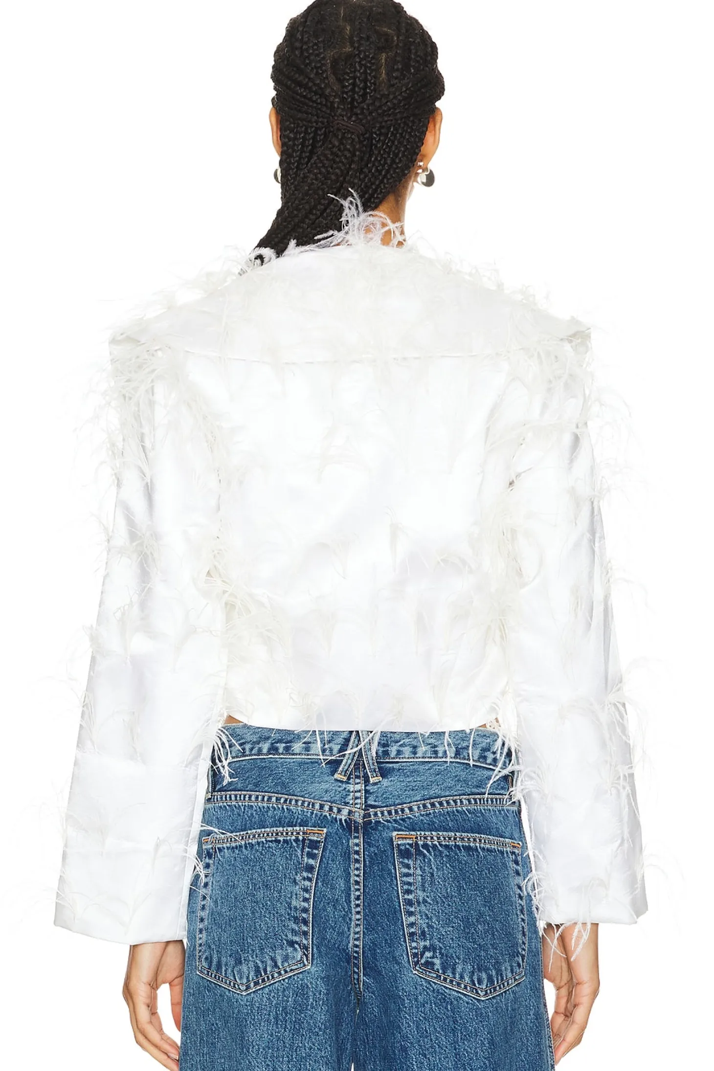100% polyester.Made in United Kingdom.Dry clean only.Front hook and bar closure.Satin fabric with real ostrich feather embellishment