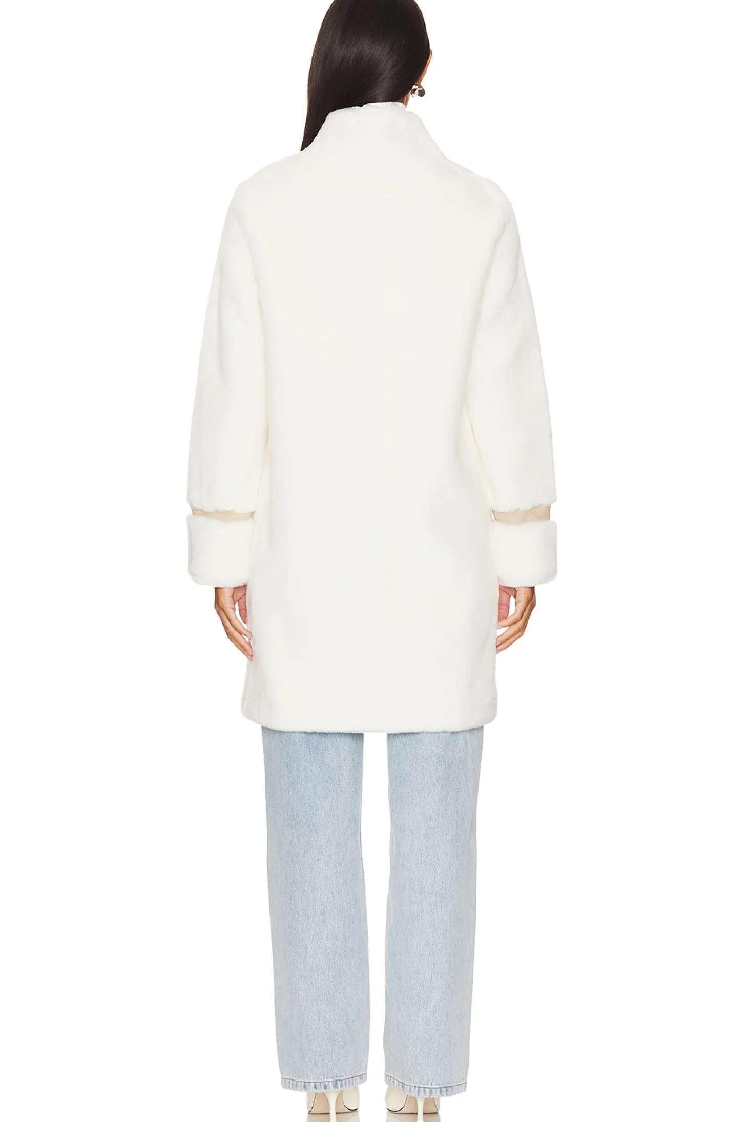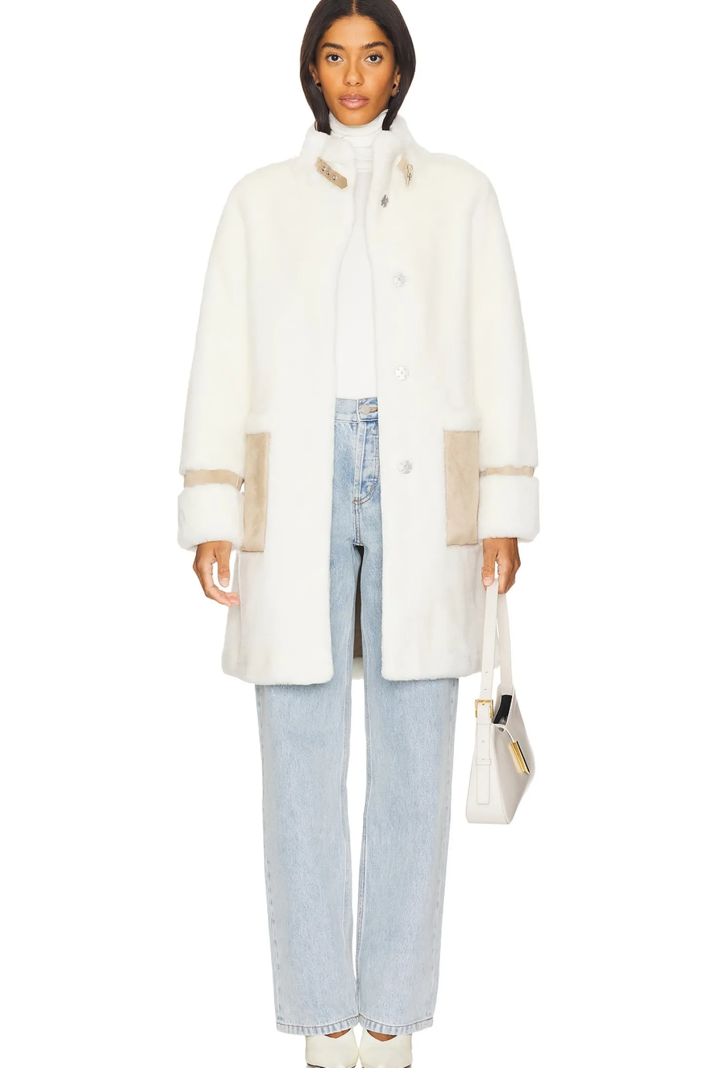 Self 1: 70% acrylic 30% wool Self 2: 100% polyester.Made in China.Dry clean only.Front snap closure.Front slip pockets Adjustable collar buckle.Heavyweight faux fur and faux leather fabric