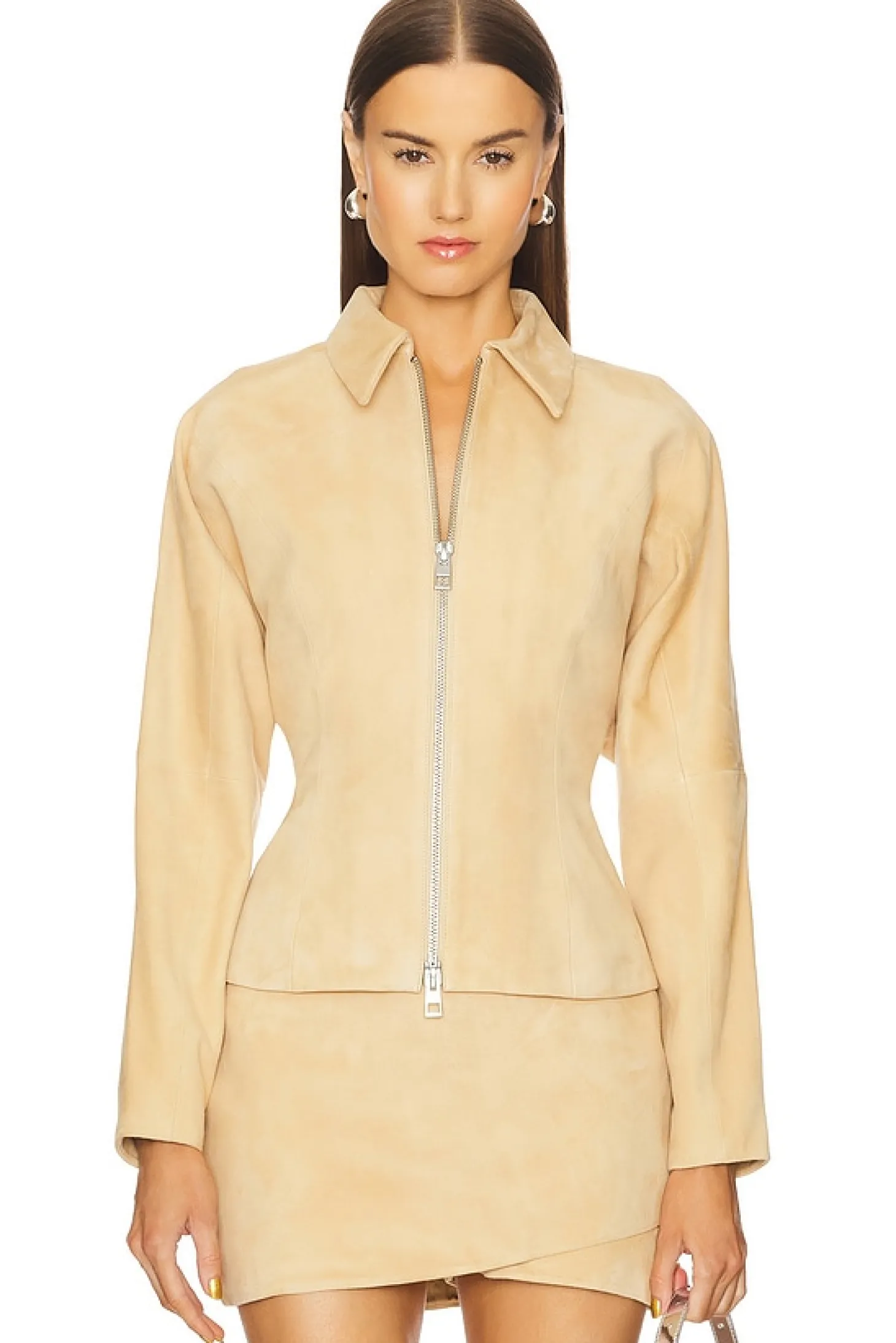 Self: 100% lambskin Lining: 96% polyester 4% elastane.Made in India.Dry clean only.Exposed front zip closure.Leather.Item not sold as set