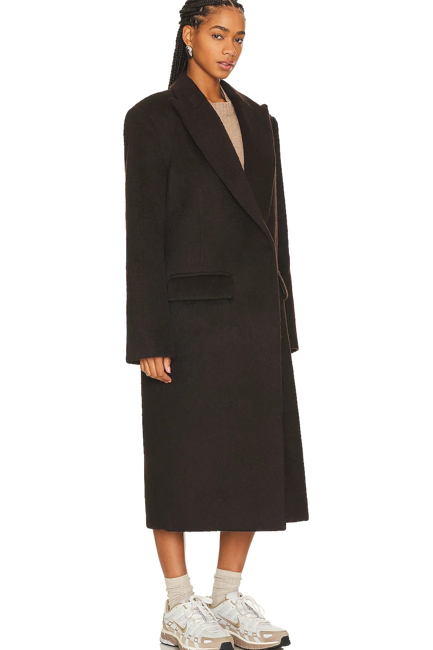Self: 80% polyester 20% wool Lining: 55% polyester 45% viscose.Made in China.Dry clean only.Open front styling.Padded shoulders.Side flap pockets.Melton fabric with back vent