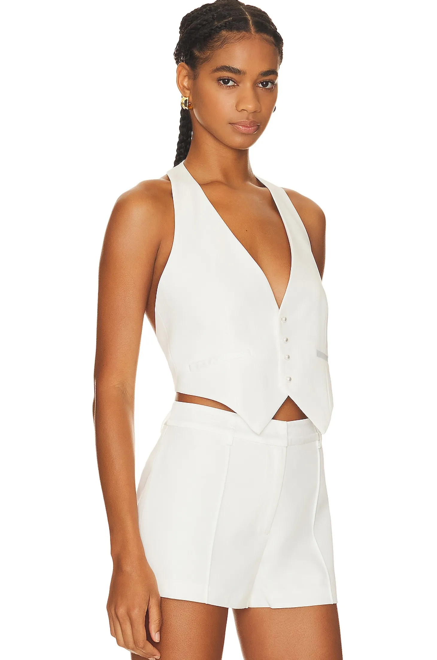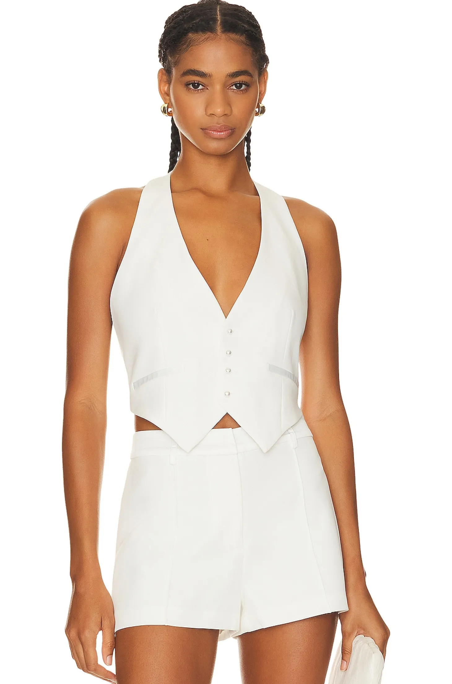 Self: 93% polyester 7% spandex Lining: 95% polyester 5% spandex.Made in China.Dry clean only.Adjustable back strap.Halterneck styling.Front faux pearl button closure.Front welt pockets.Item not sold as a set