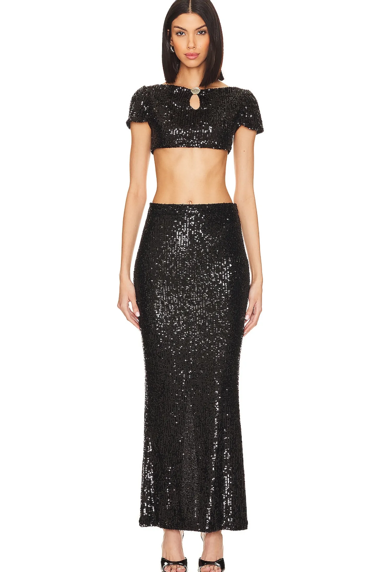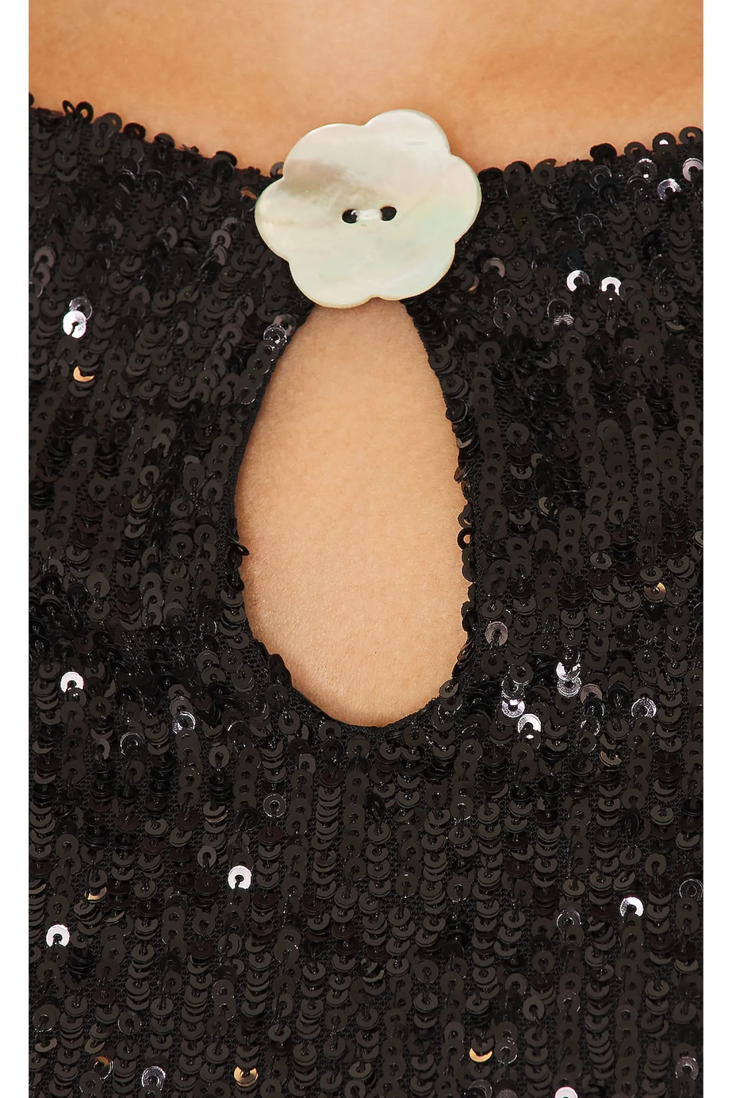 Viscose blend.Made in USA.Hand wash recommended.Back tie detail.Keyhole cut-out at front.Allover sequin fabric with resin flower detail.Item not sold as a set
