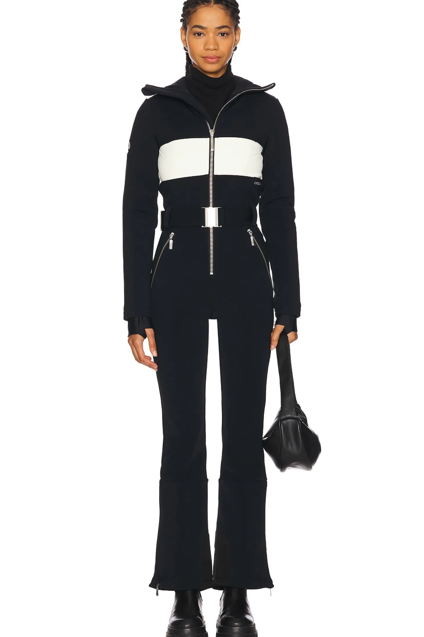 43% polyester 43% polyamide 14% elastane.Made in Portugal.Machine wash.Front zipper closure.Detachable waist belt with buckle closure Side zipper pockets.Thumbhole sleeve lining Snow catcher hem.Midweight velour fabric