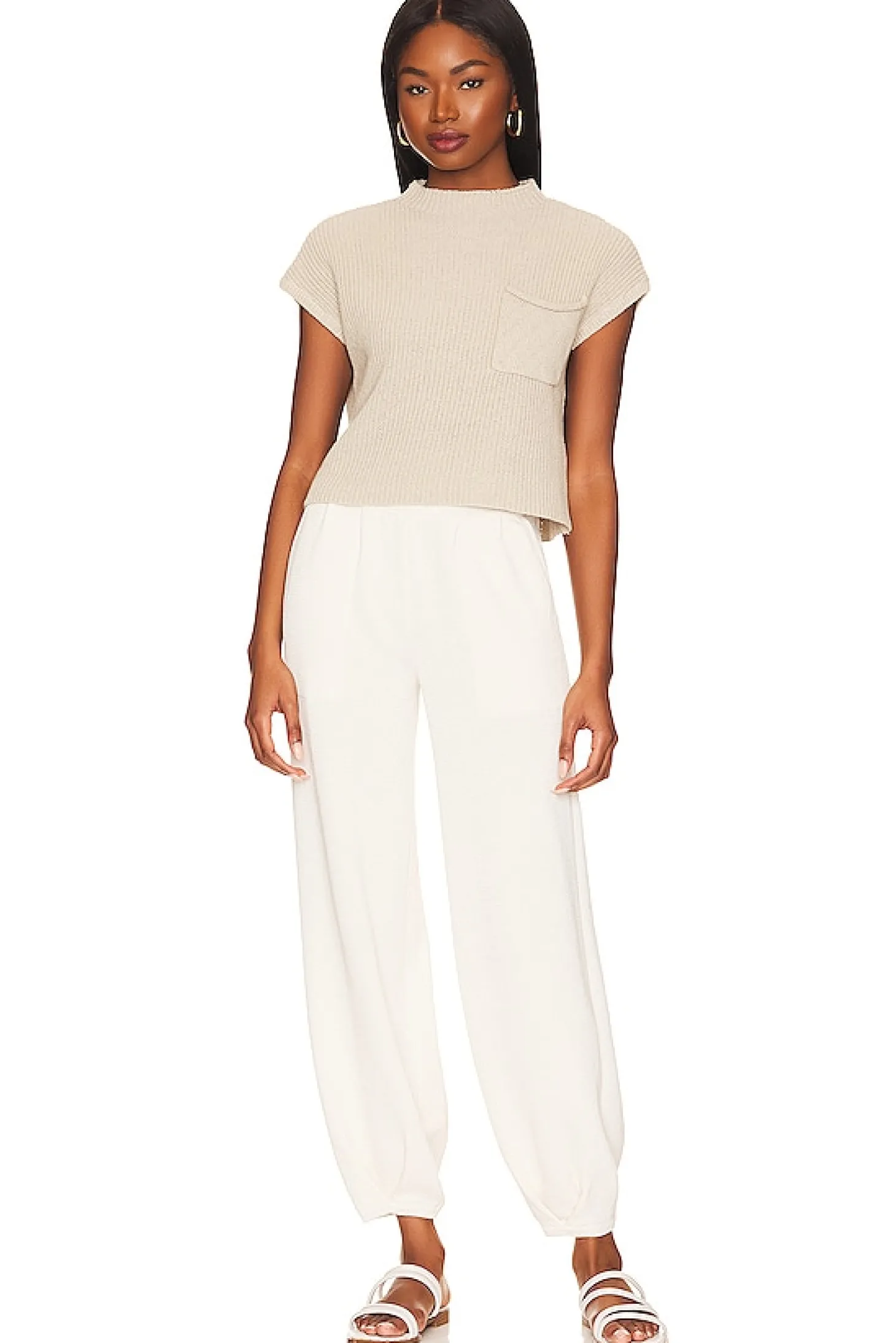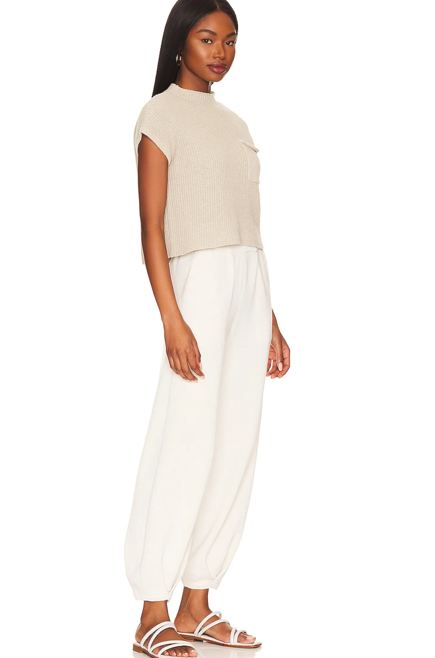 Self: 100% cotton Lining: 87% polyester 13% linen.Made in China.Hand wash.Breast slip pocket.Pull-on styling with elastic waistband.Side slant pockets.Ribbed knit fabric Sold as a set.21" at the knee narrows to 10" at the leg opening