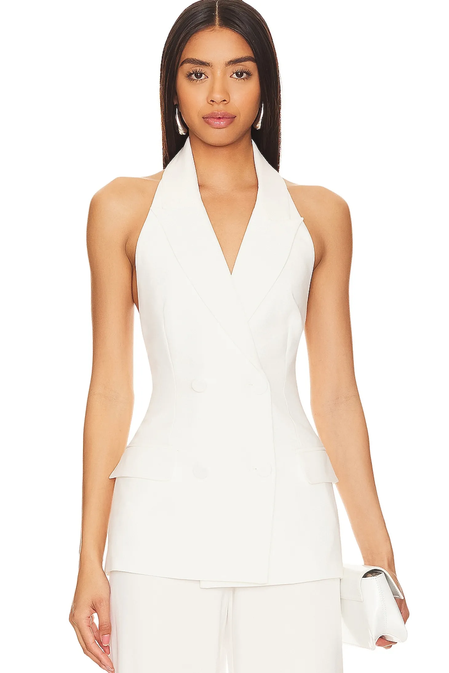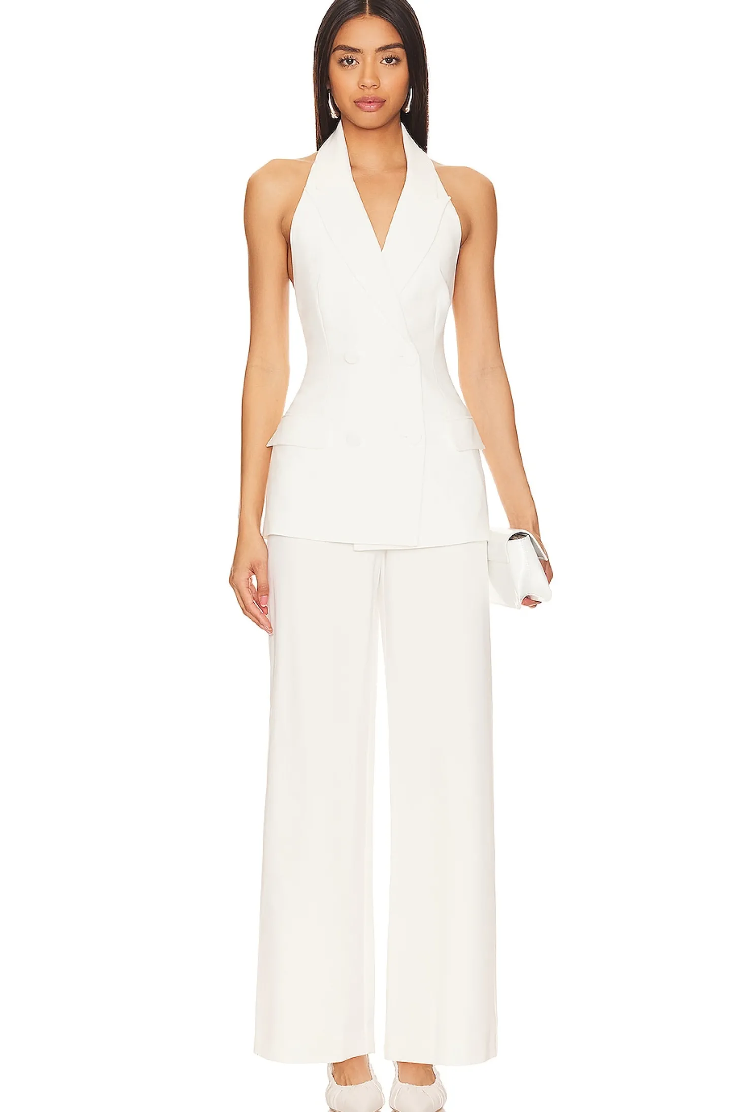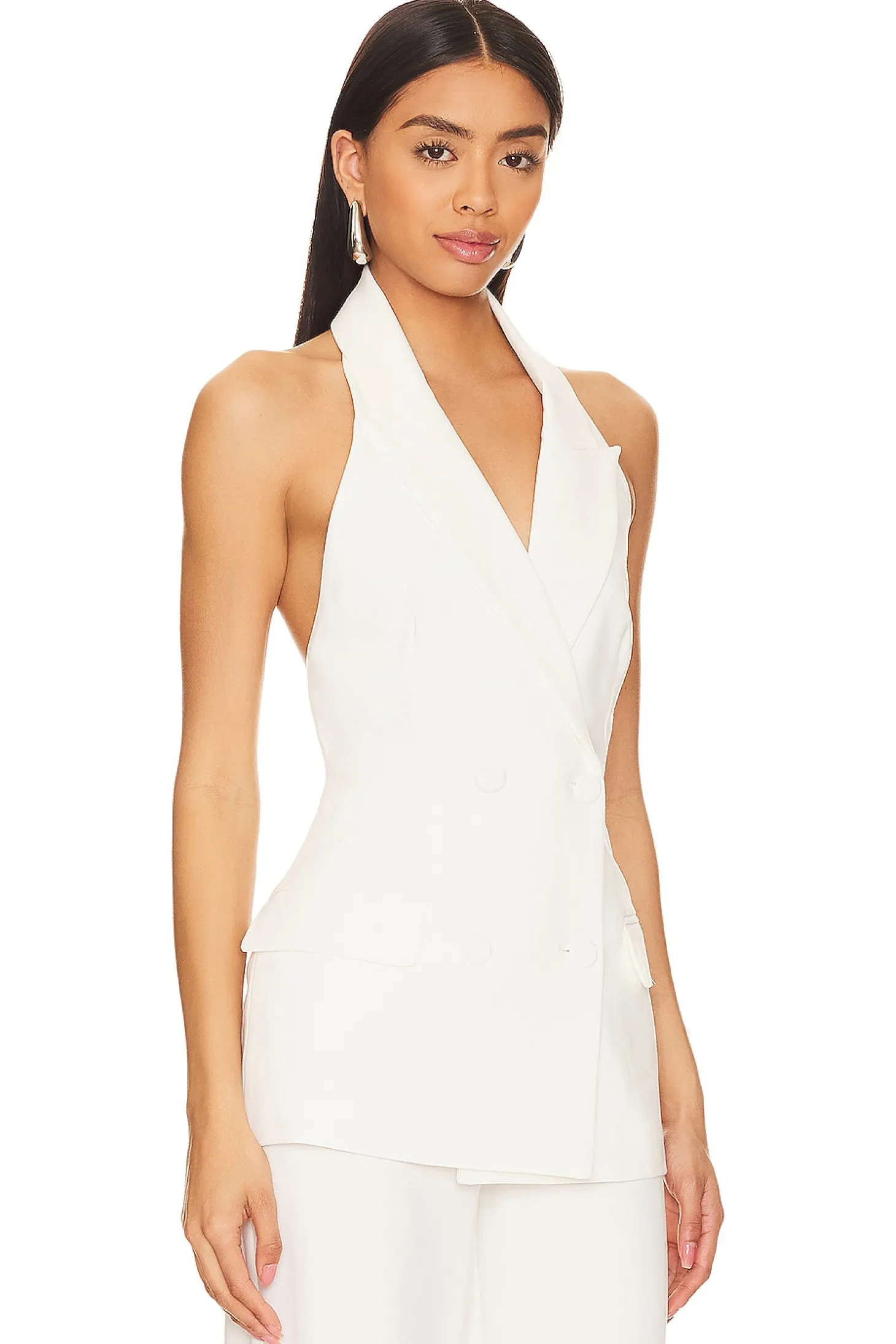 Self: 65% polyester 30% cotton 5% elastane Lining: 95% polyester 5% elastane.Made in China.Machine wash.Dual-breasted front button closure.Side flap pockets.Crepe suiting fabric.Item not sold as set