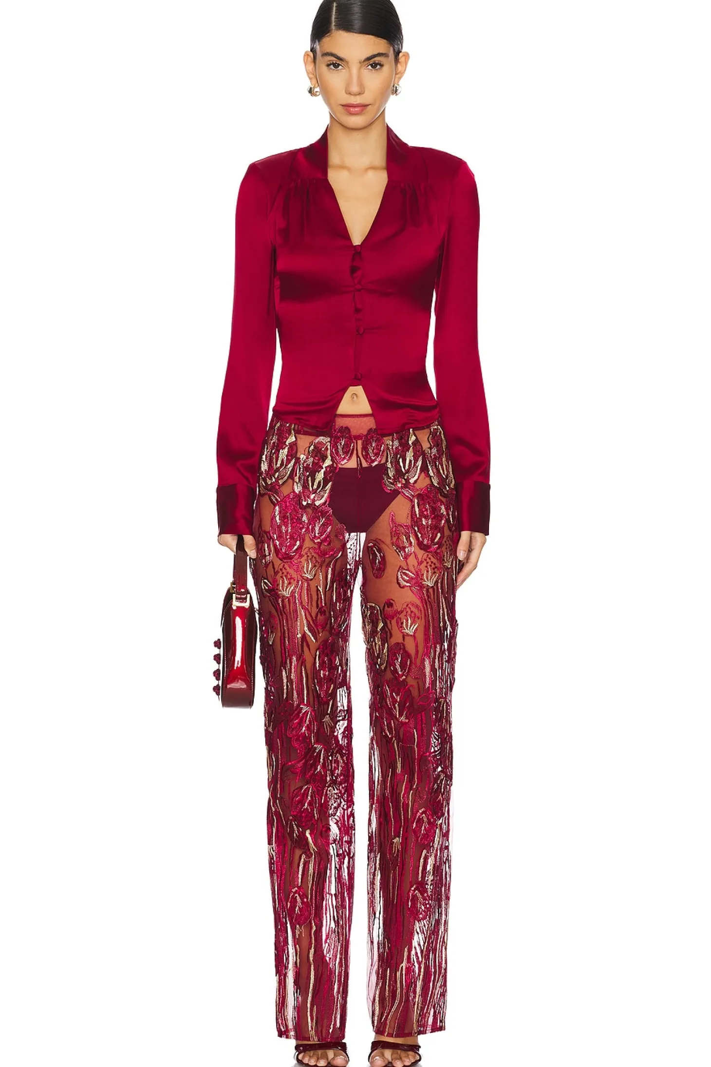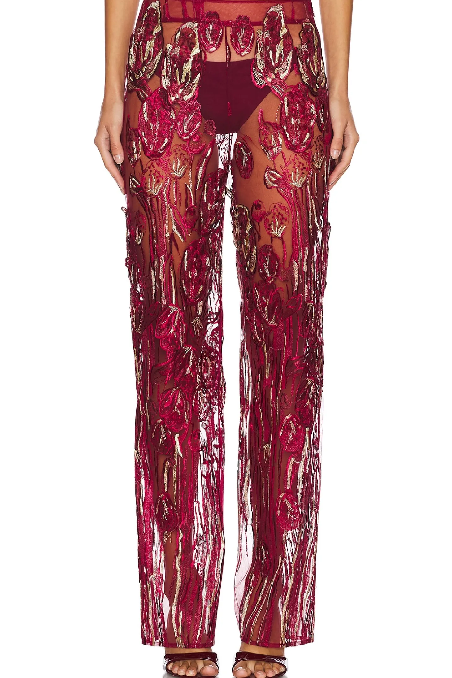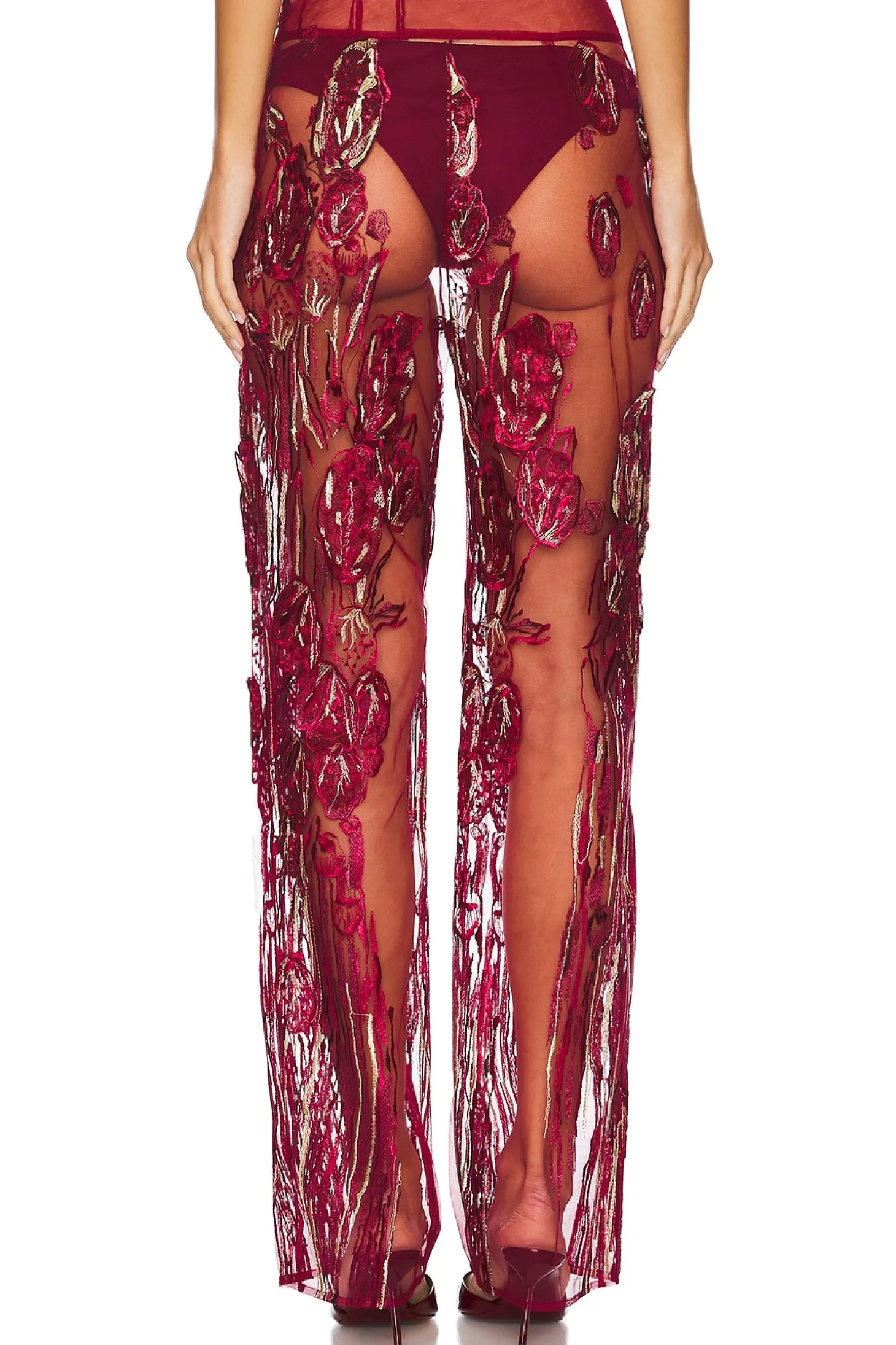 100% nylon.Made in China.Machine wash.Hidden side zip closure.Embroidery throughout Lightweight mesh fabric.Garment is intentionally sheer, undergarments will show through. Please note undergarment not included.20" at the knee and 18" at the leg opening
