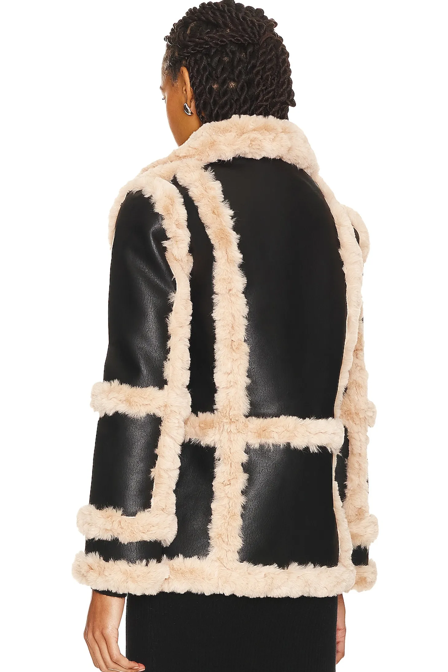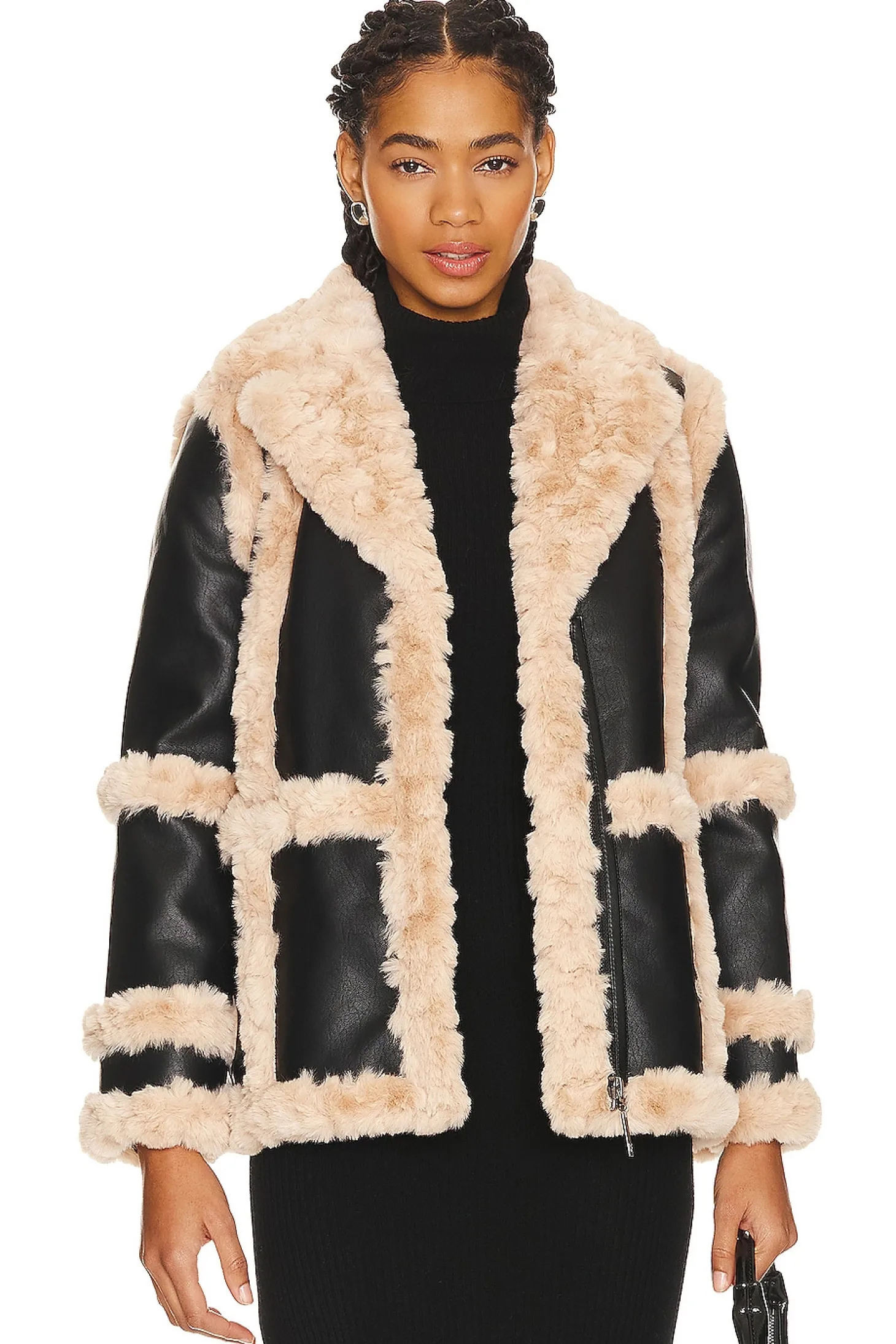 Self: 100% polyurethane Contrast Fabric: 100% polyester.Made in China.Dry clean only.Front zipper closure.Faux leather with teddy faux fur trim