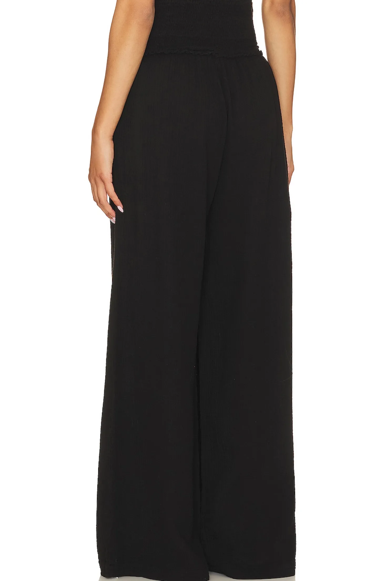 100% cotton.Made in USA.Machine wash.Pull-on styling with smocked waistband.Side slant pockets.Lightweight gauze fabric.Item not sold as a set.23" at the knee breaks to 27" at the leg opening