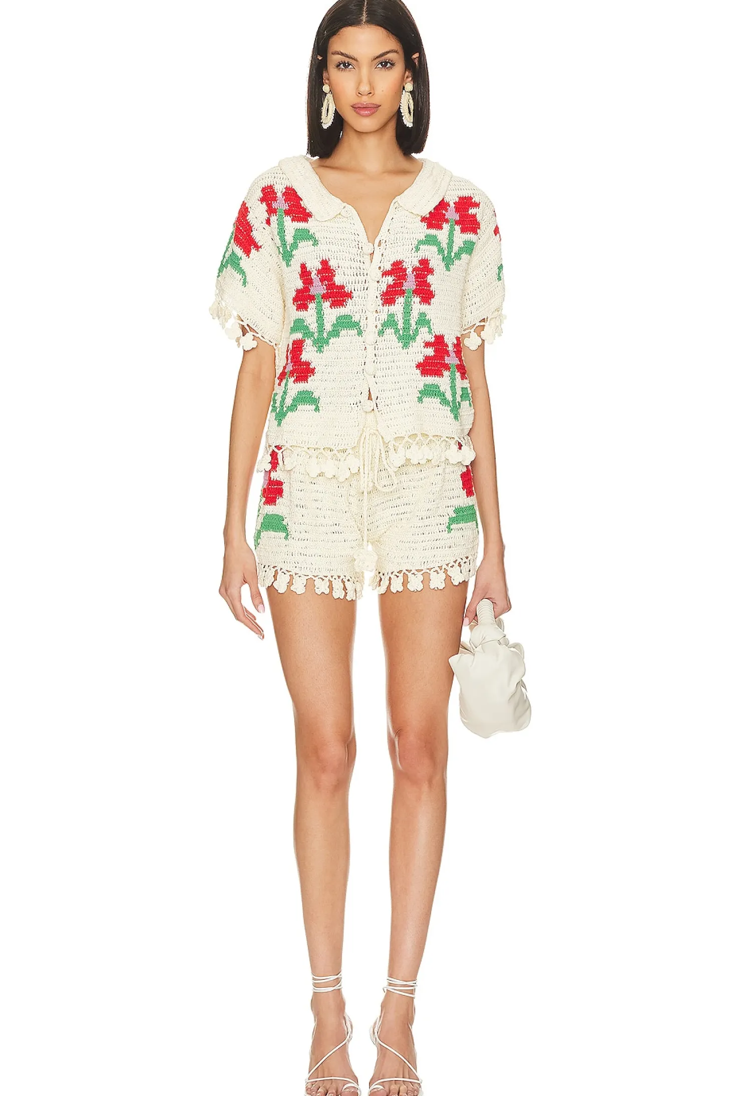 100% cotton.Made in Indonesia.Hand wash.Elastic drawstring tie closure.Crochet knit fabric with embellished crochet trim.Shorts measure approx 12" in length Size XS waist measures approx 45.6" in circumference