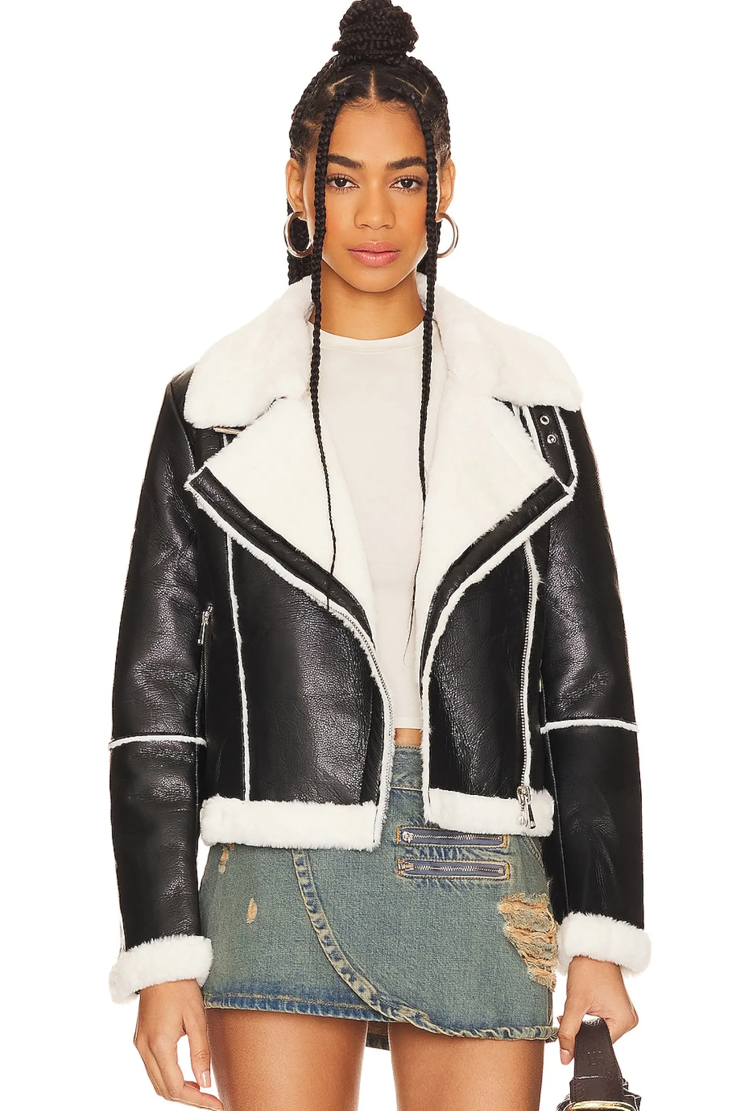 Elevate your winter wardrobe with the superdown Genna Zip Up Jacket. This stylish jacket features a chic black and white color scheme, faux leather fabric, and a cozy faux fur lining. Combining warmth with fashion, it's the perfect addition to your winter wardrobe..Self: 80% poly 20% polyurethane Lining: 100% poly.Made in China.Dry clean only.Front zipper closure.Side zip pockets.Faux leather.Faux fur lining