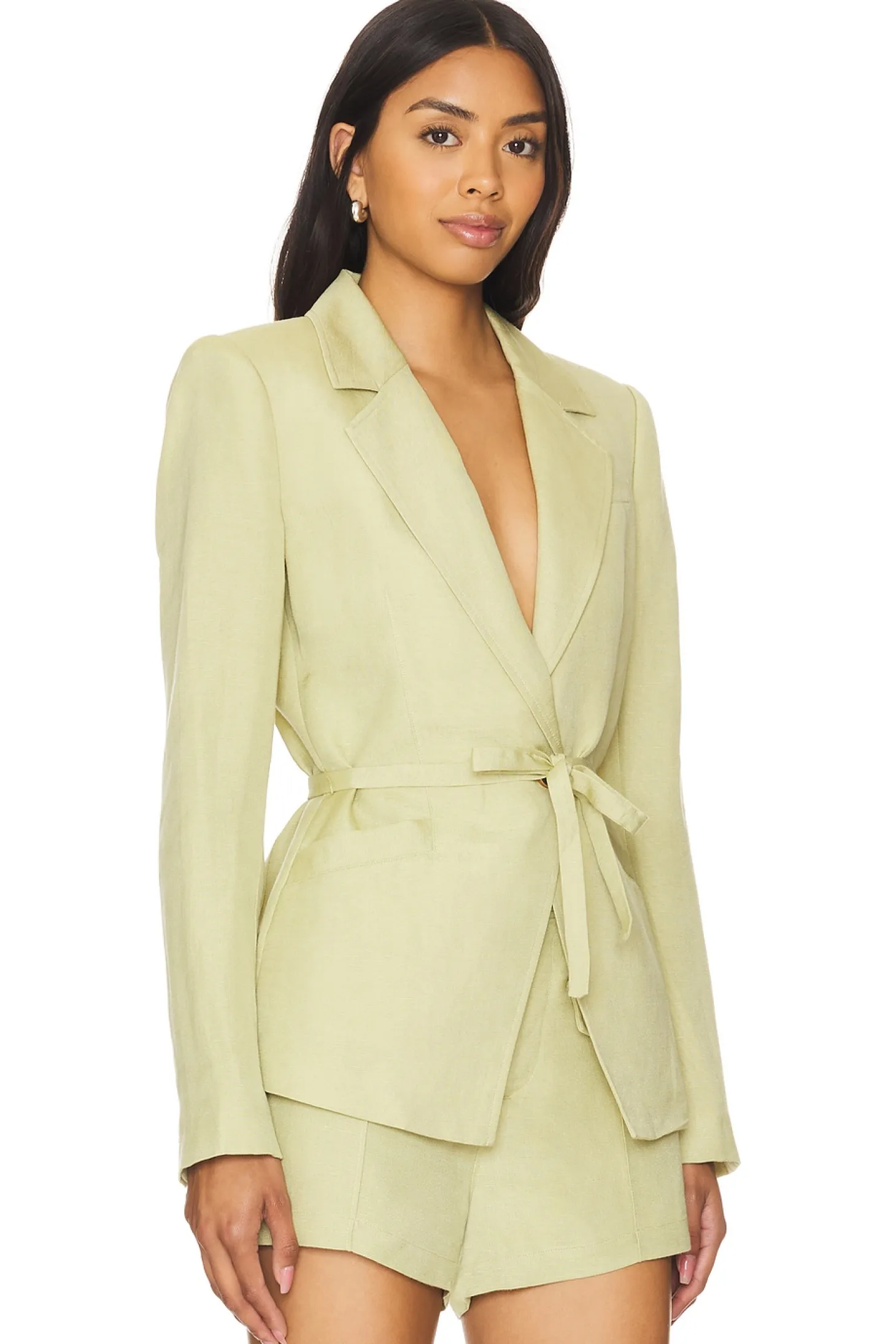 Self: 58% linen 42% rayon Lining: 100% rayon.Made in China.Hand wash.Singular front button closure.Attached waist tie.Button cuffs.Padded shoulders.Lightweight twill fabric Item not sold as a set
