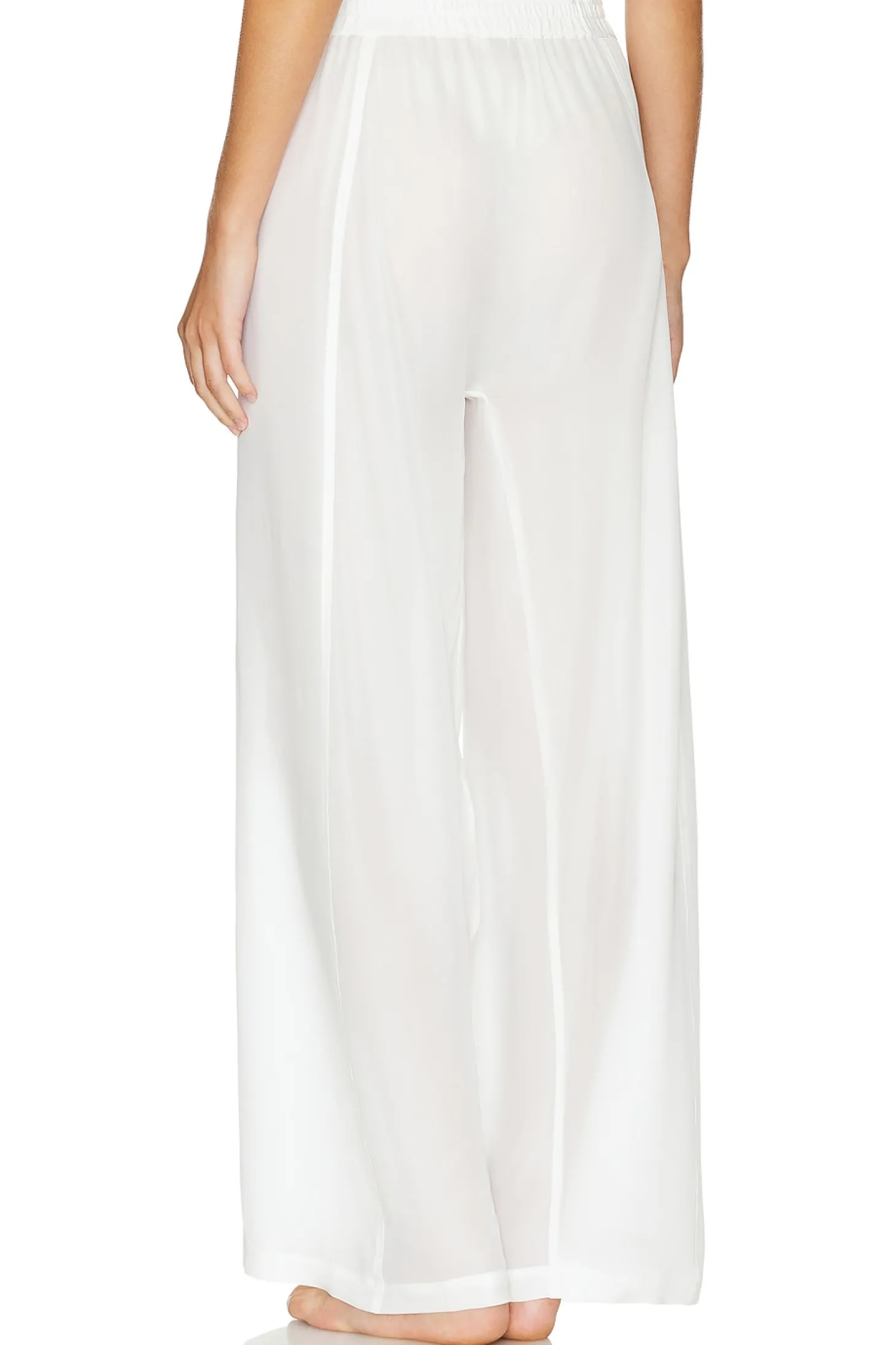 100% silk.Made in China.Dry clean.Garment is made with a semi-sheer fabric, undergarments can show through.Pull-on styling.25" at the knee and breaks to 26" at the leg opening