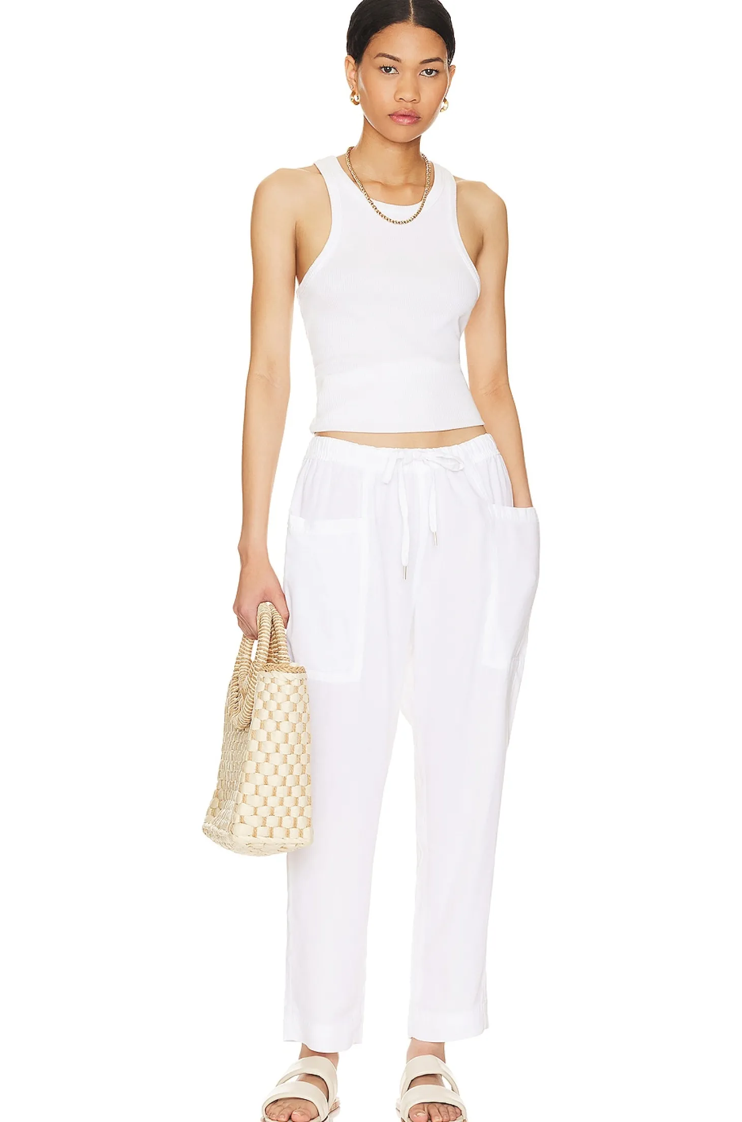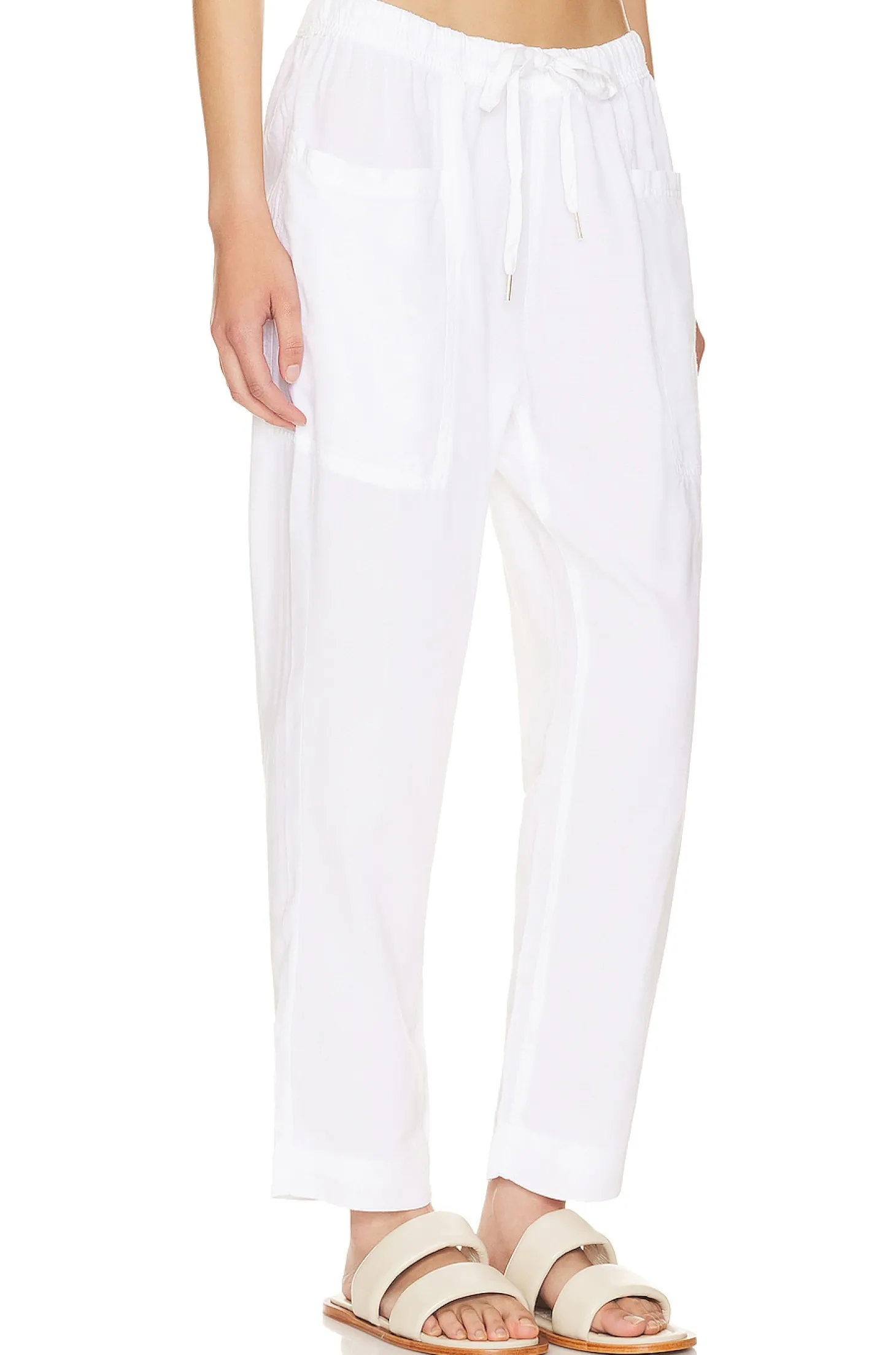 73% lyocell 27% linen.Made in China.Machine wash.Drawstring waist.Cargo style pockets.Lightweight linen fabric.16" at the knee narrows to 14" at the leg opening
