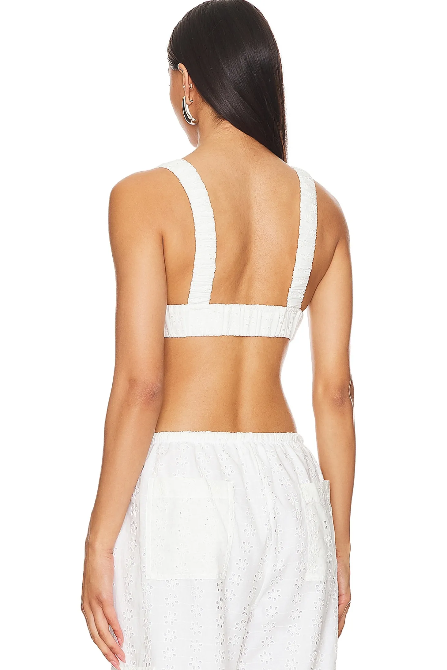 100% cotton.Made in Peru.Hand wash.Elastic underband and shoulder straps.Lightweight eyelet fabric.Item not sold as a set