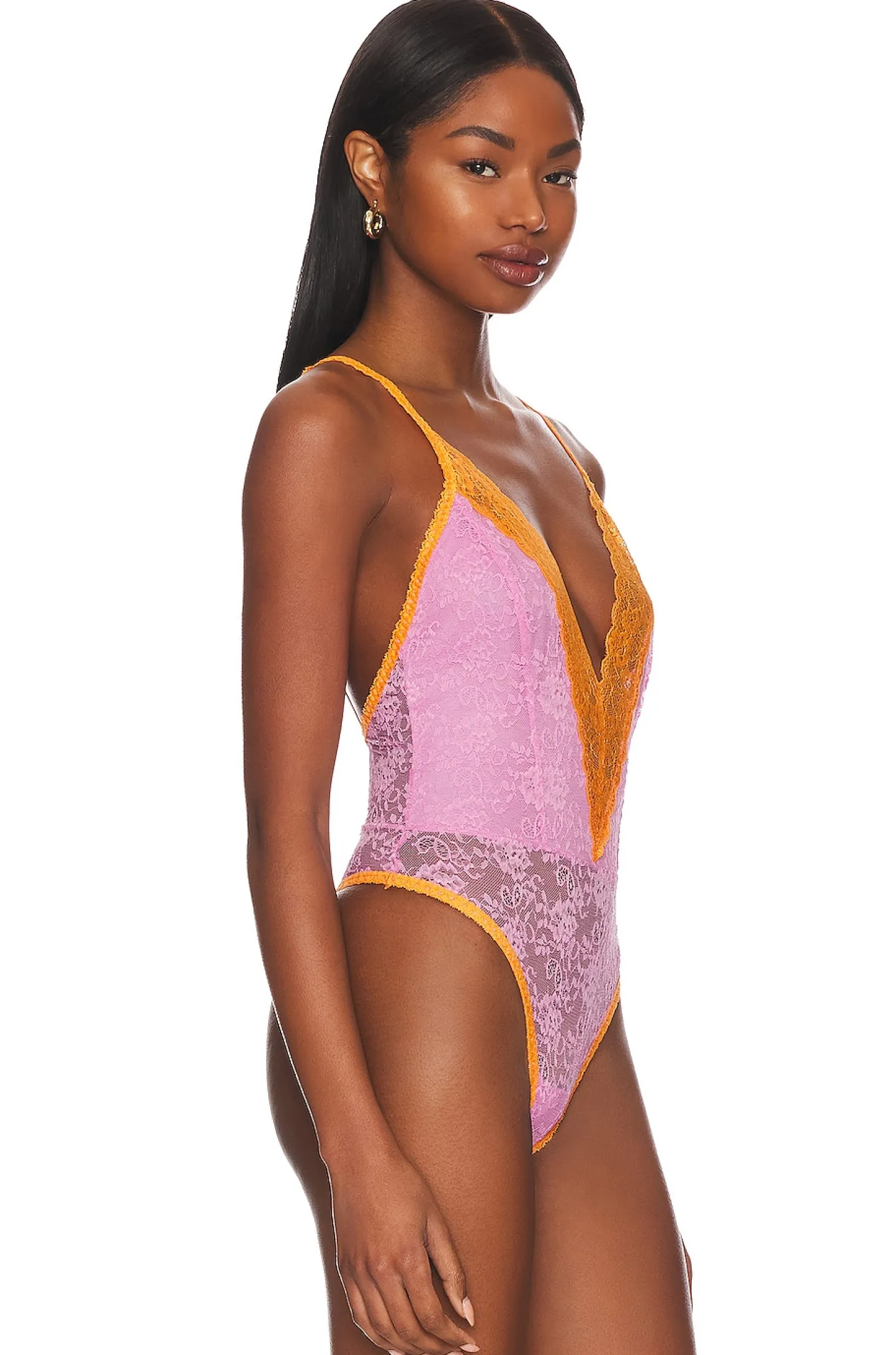 Self: 90% nylon 10% spandex Lining 1: 89% nylon 11% elastane Lining 2: 100% cotton.Made in China.Hand wash.Adjustable shoulder straps.Plunging neckline.Thong back.Lace fabric