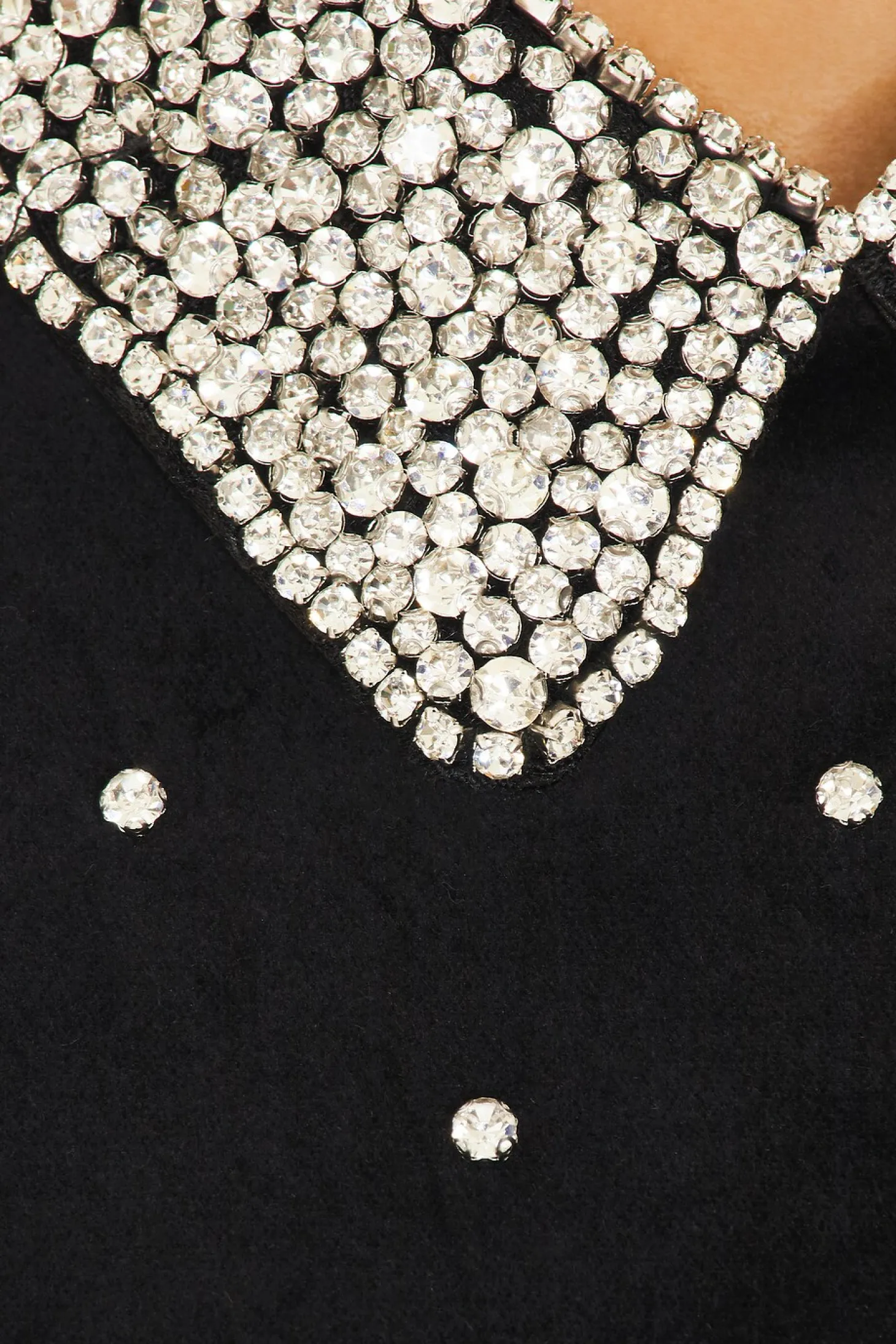 Self: 98% polyester 2% elastane Lining 1: 97% polyester 3% elastane Lining 2: 100% polyester Contrast Fabric: 98% cotton 2% elastane.Made in China.Dry clean only.Fully lined.Exposed back zipper closure.Side seam pockets.Rhinestone embellished velvet bodice and crepe skirt
