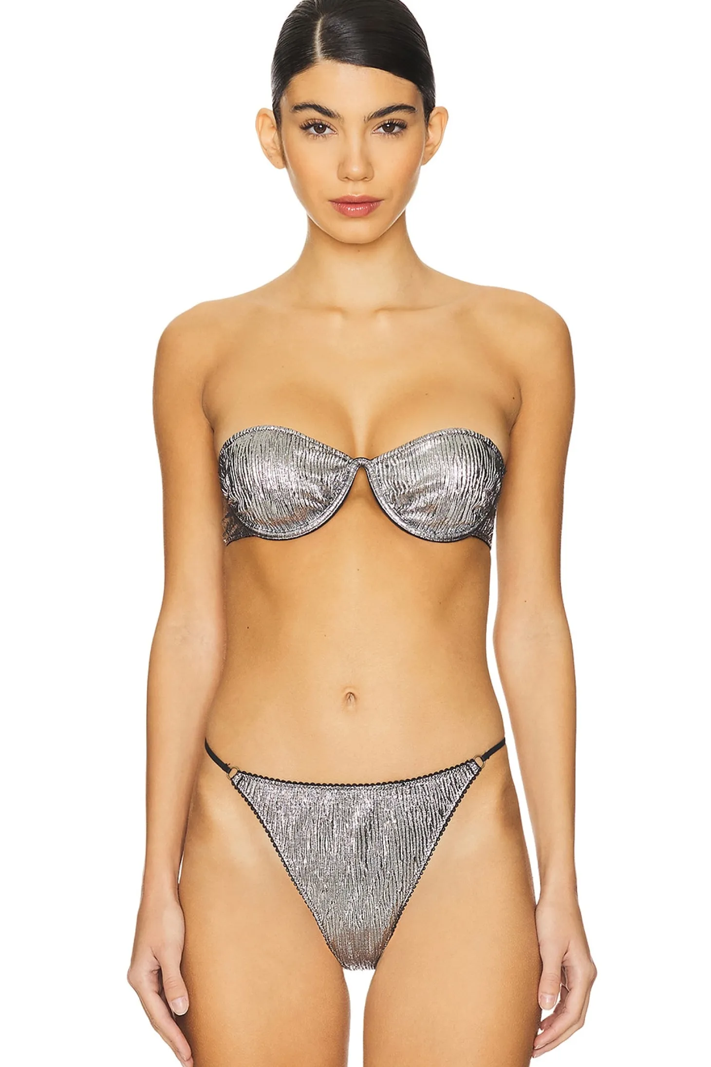 54% polyester 39% polyamide 7% elastane.Made in China.Hand wash.Unpadded underwire cups.Back strap with hook and eye closure.Detachable and adjustable shoulder straps.Satin fabric with metallic threading and lace trim.Item not sold as set