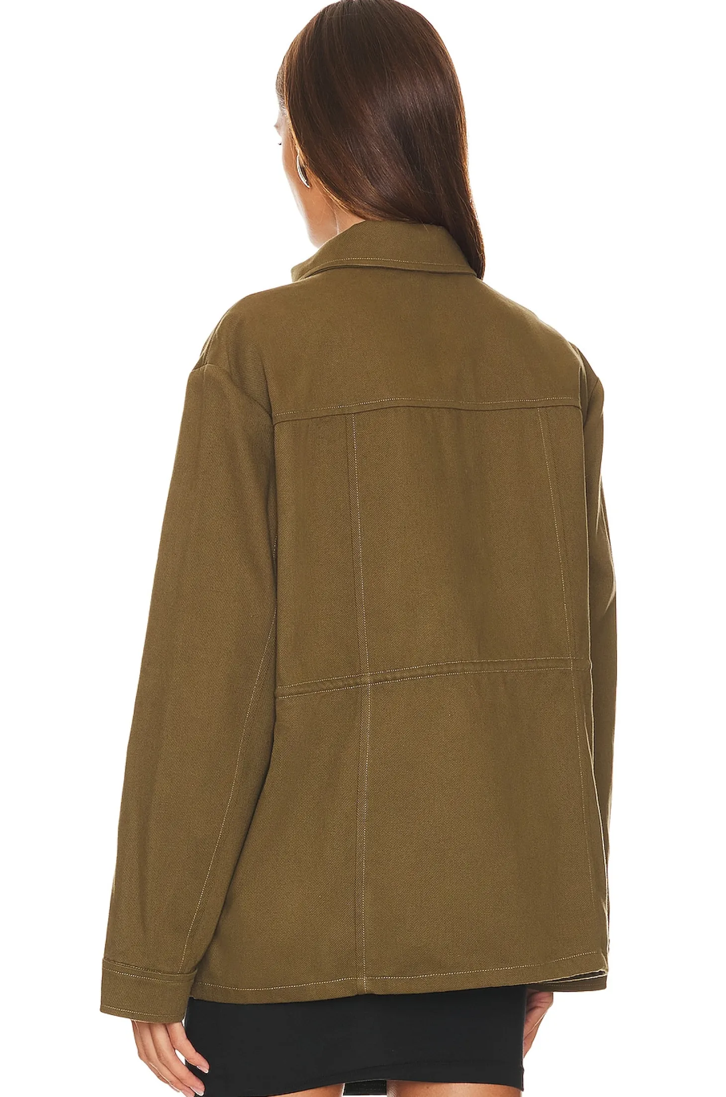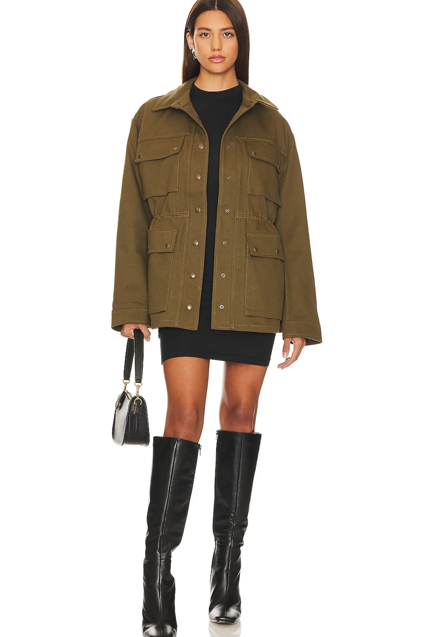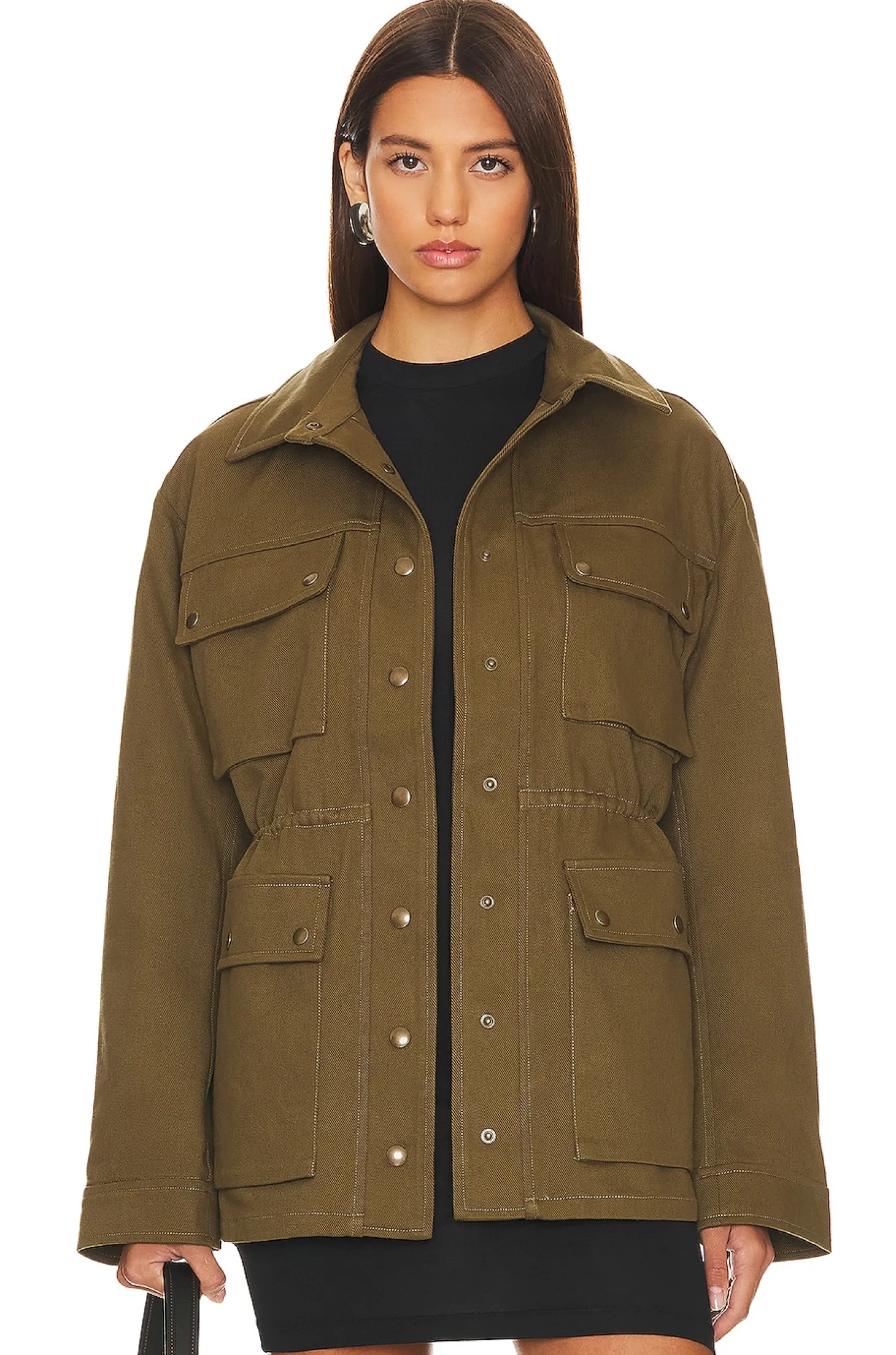 100% cotton.Made in China.Hand wash.Button down closure.Front flap pockets with button closures.Ruched waist with interior draw cords.Midweight denim fabric