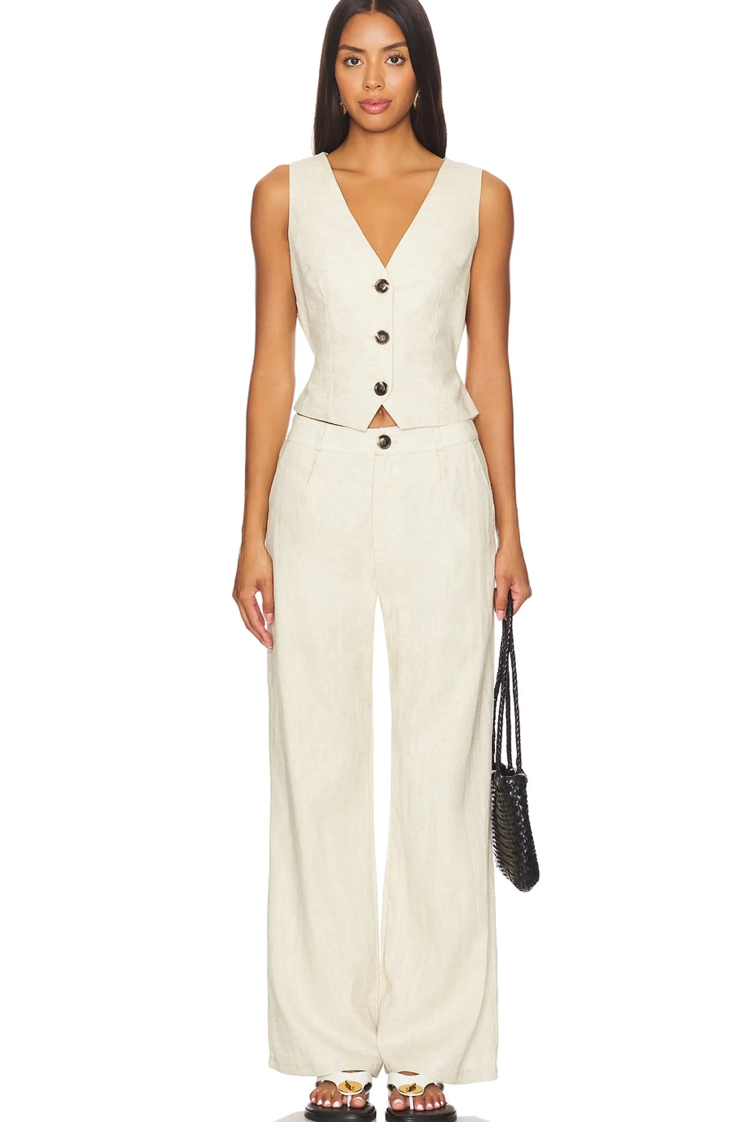 Self: 95% linen 5% cotton Lining: 100% cotton.Made in China.Machine wash.Zip fly with button closure.4-pocket design.Midweight linen fabric.Item not sold as a set.20" at the knee breaks to 21" at the leg opening