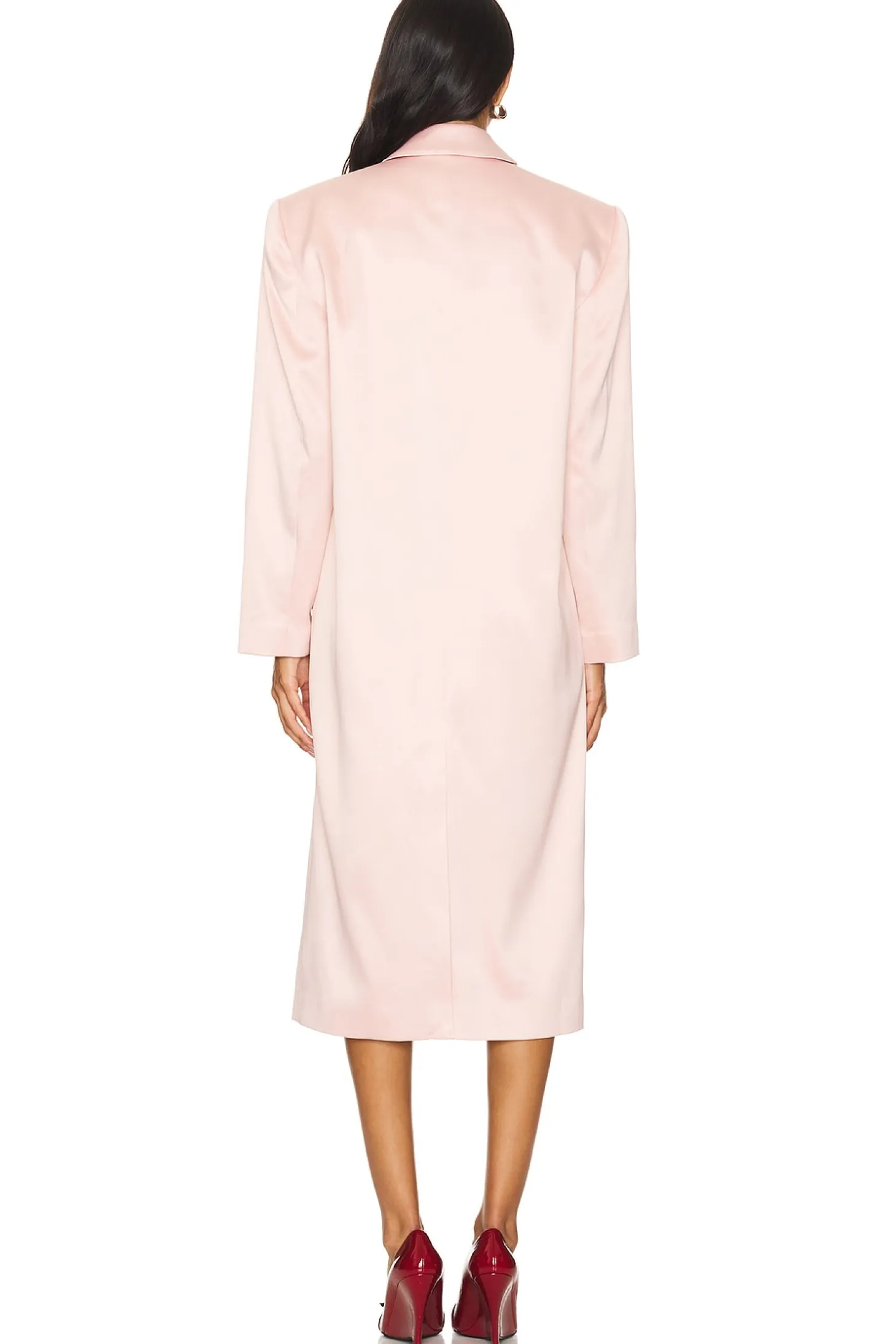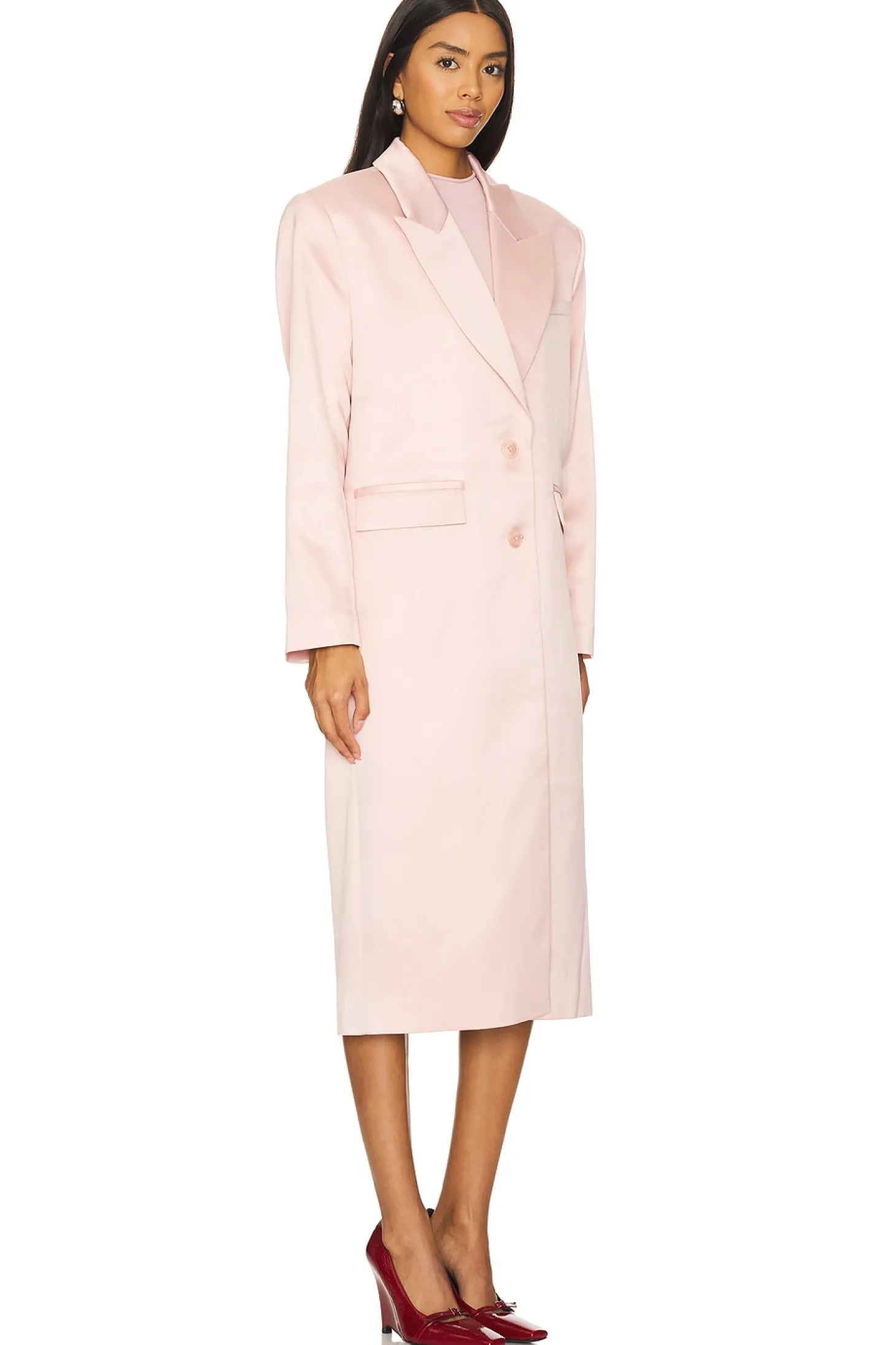 Self & Lining: 97% polyester 3% elastane.Made in China.Dry clean only.Front button closure.Singular welt pocket and side flap pockets.Structured padding at shoulders.Satin fabric