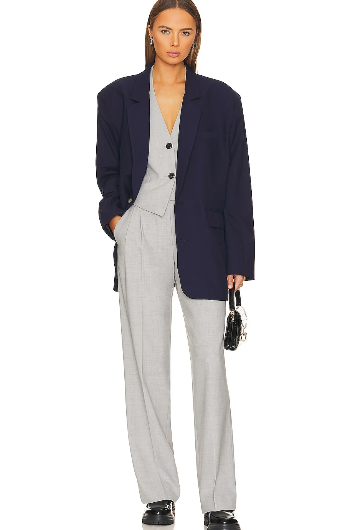 48% virgin wool 48% polyester 4% elastane.Made in China.Dry clean only.Front button closure.Halterneck styling.Adjustable back strap detail.Faux front welt pockets.Item not sold as a set