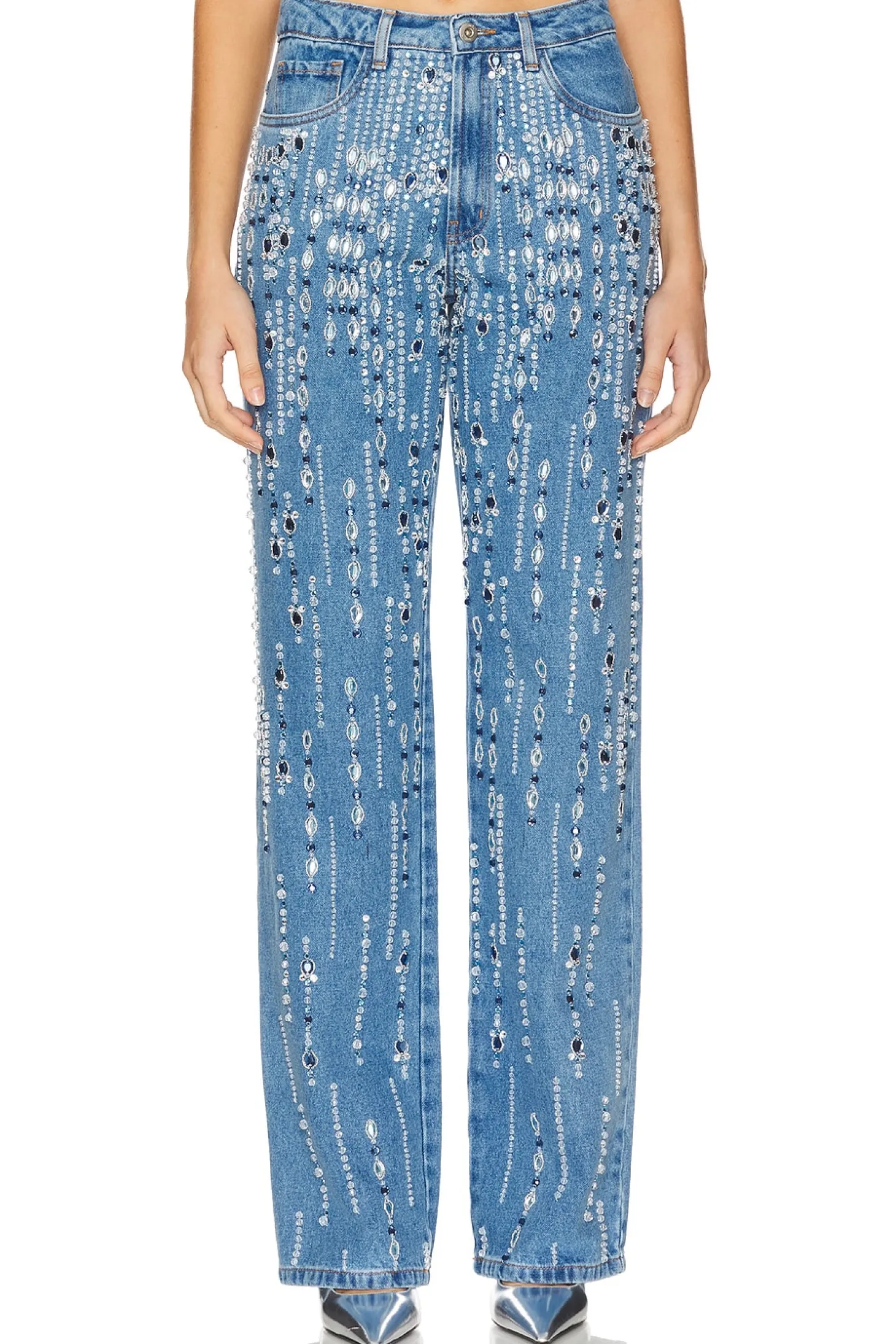100% cotton.Made in Brazil.Hand wash.Zip fly with button closure.5-pocket styling.Denim fabric with rhinestone embellishment at front.Item not sold as a set.19" at the knee and narrows to 18" at the leg opening