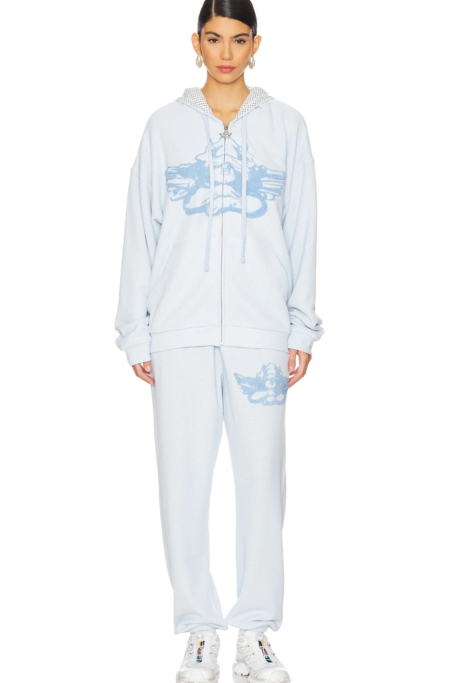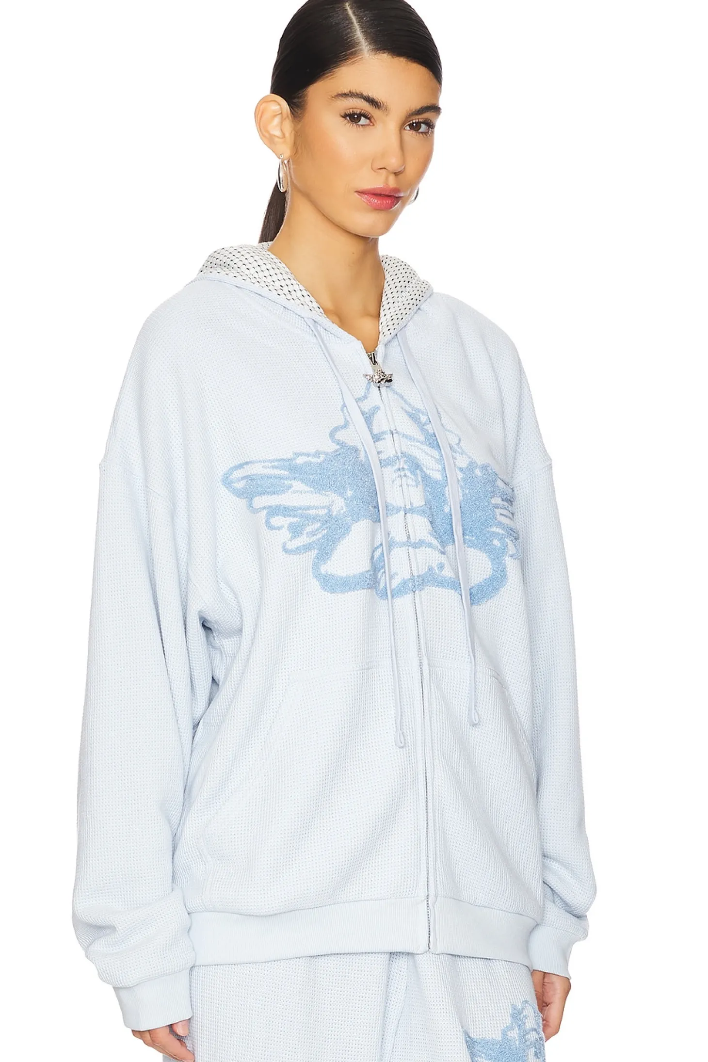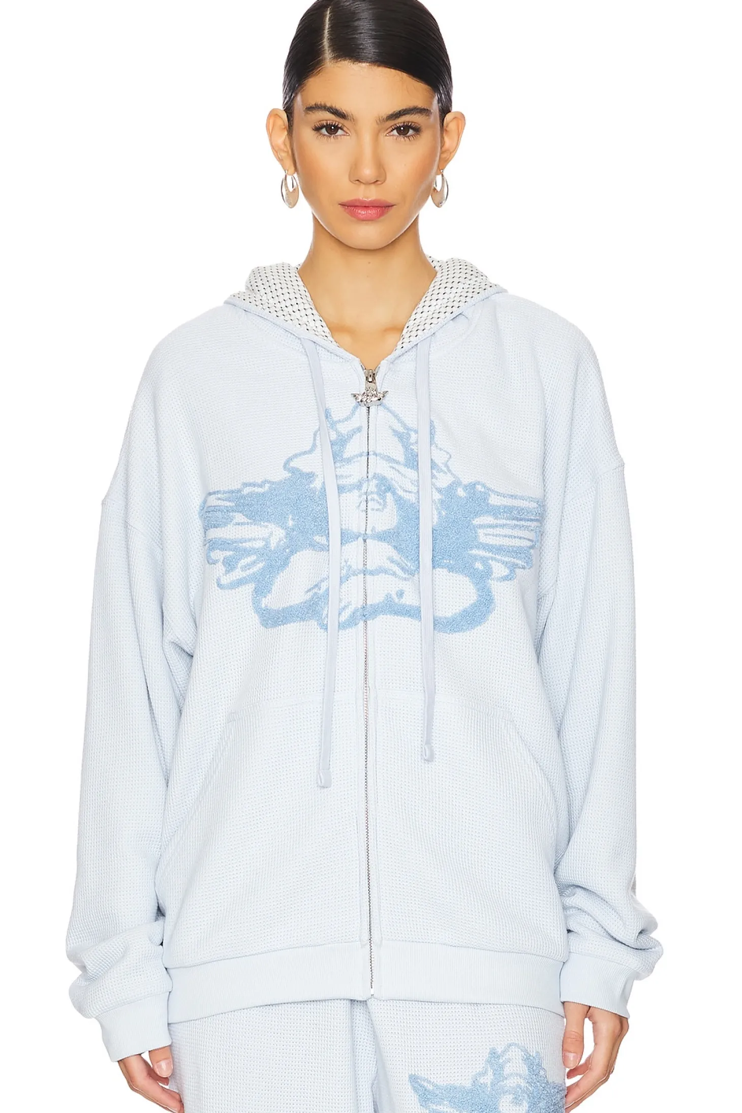 Self: 68% polyester 29% rayon 3% spandex Lining: 74% polyester 25% rayon 1% spandex.Made in China.Machine wash.Front zip closure with logo hardware.Front side pockets Front embroidered logo and back screen printed graphic.Heavyweight fleece fabric Item not sold as a set