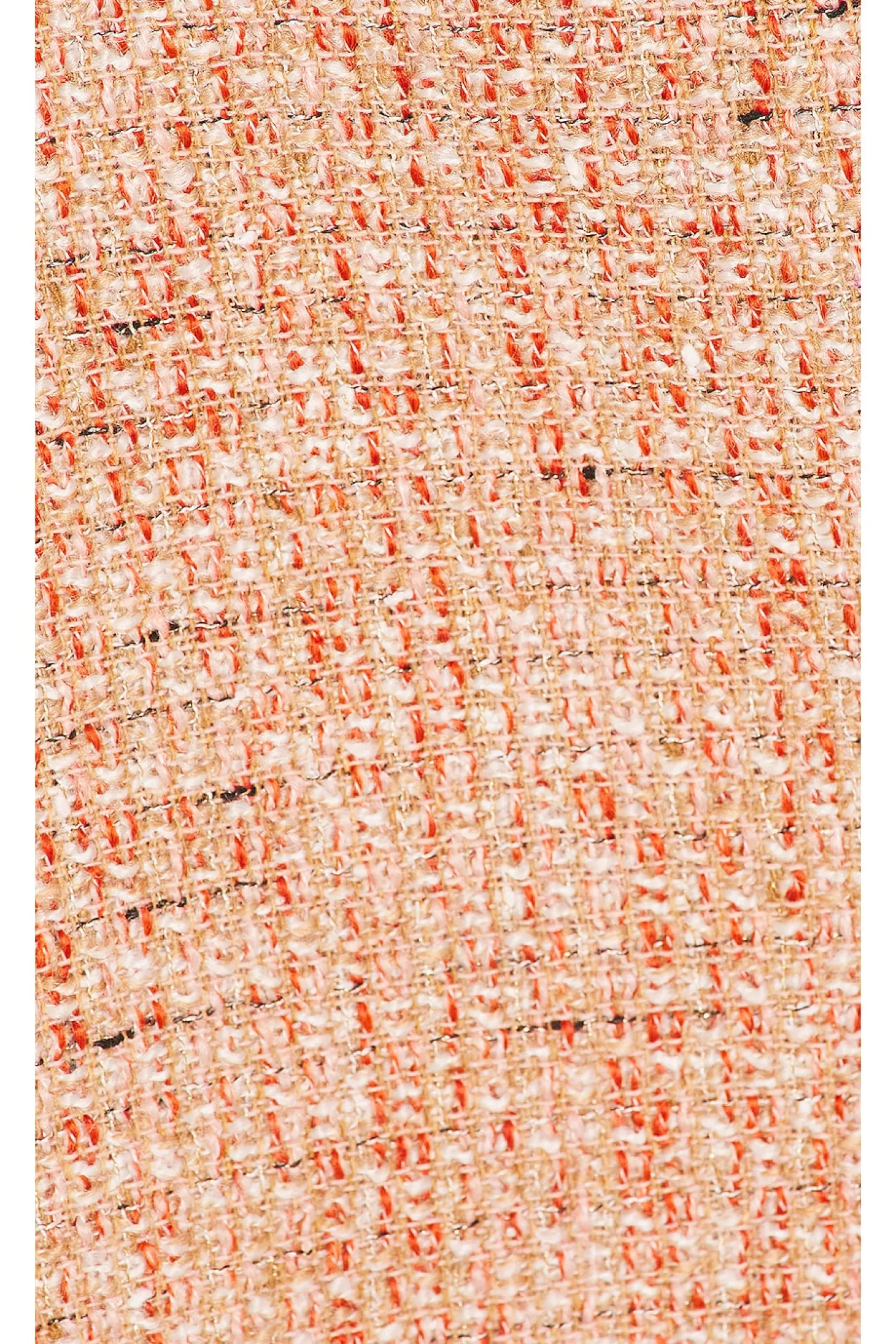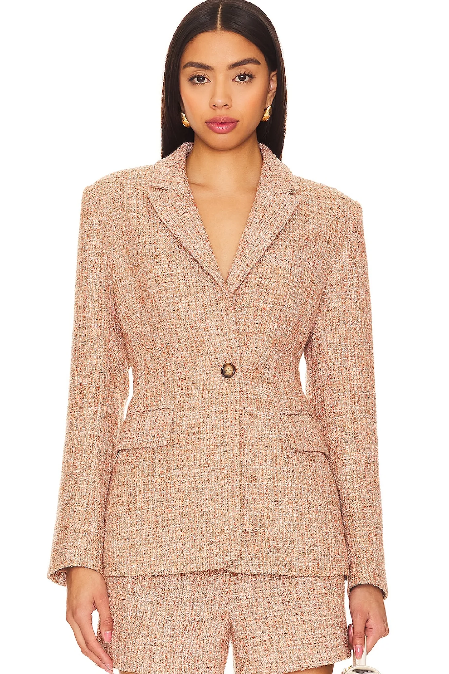 Self: 83% polyester 10% acrylic 7% other fibers Lining: 100% polyester.Made in China.Hand wash.Singular front button closure.Padded shoulders.Breast slip pocket and side flap pockets.Tweed fabric Item not sold as set