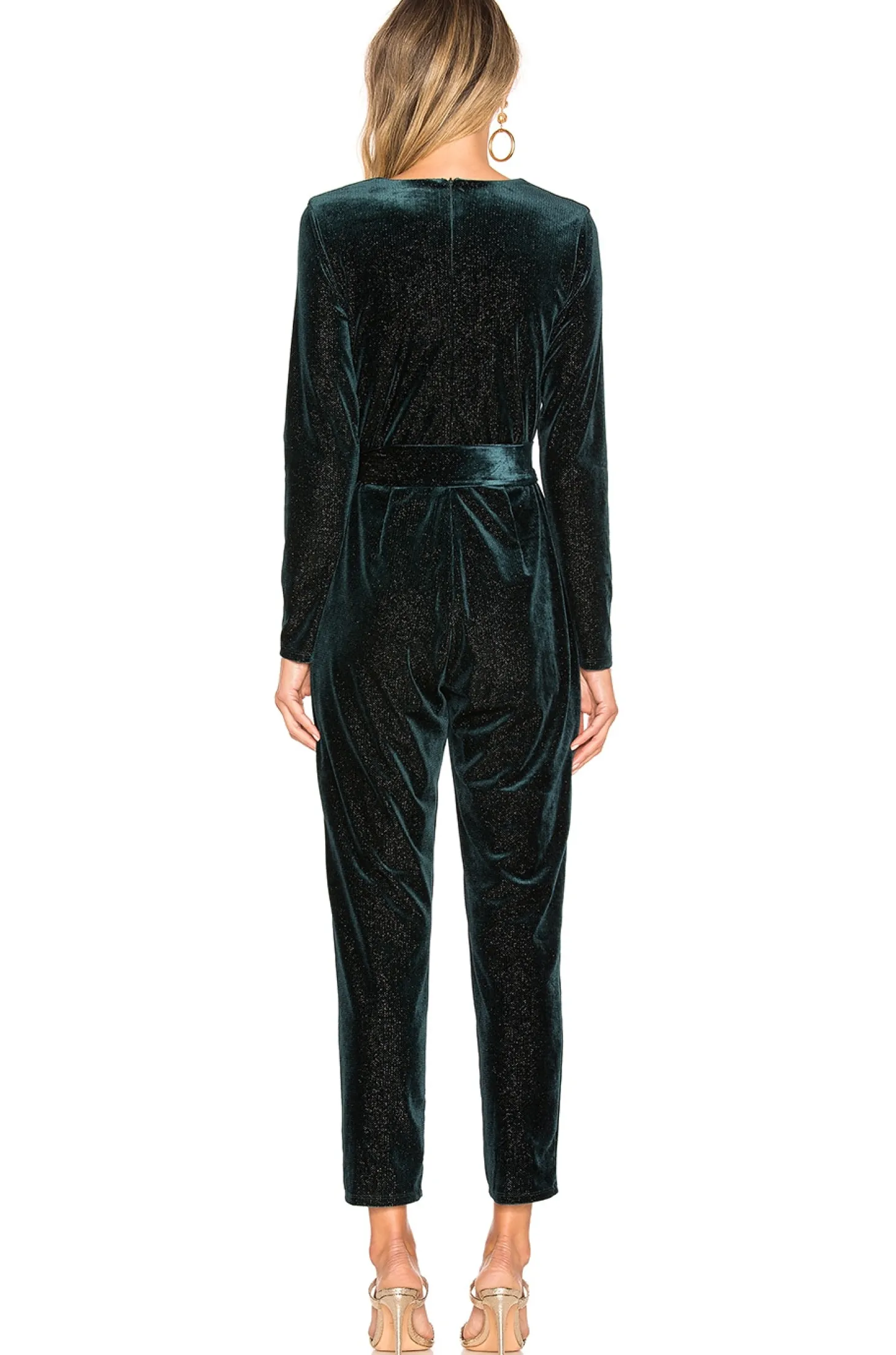 Sleek and high in glamour is the Hart Jumpsuit by Lovers + Friends. Gathered at the waist by a wide sash, the rich velvet design features flecks of metallic threading that shimmer with the slightest movement..Self: 86% polyester 10% elastane 2% nylon 2% silver thread Lining: 100% poly.Hand wash cold.Surplice front.Waist tie detail.Hidden back zipper closure.Body measures approx 29" in length Sleeve measures approx 24" in length 16" at the knee narrows to 12" at the leg opening.Made in China