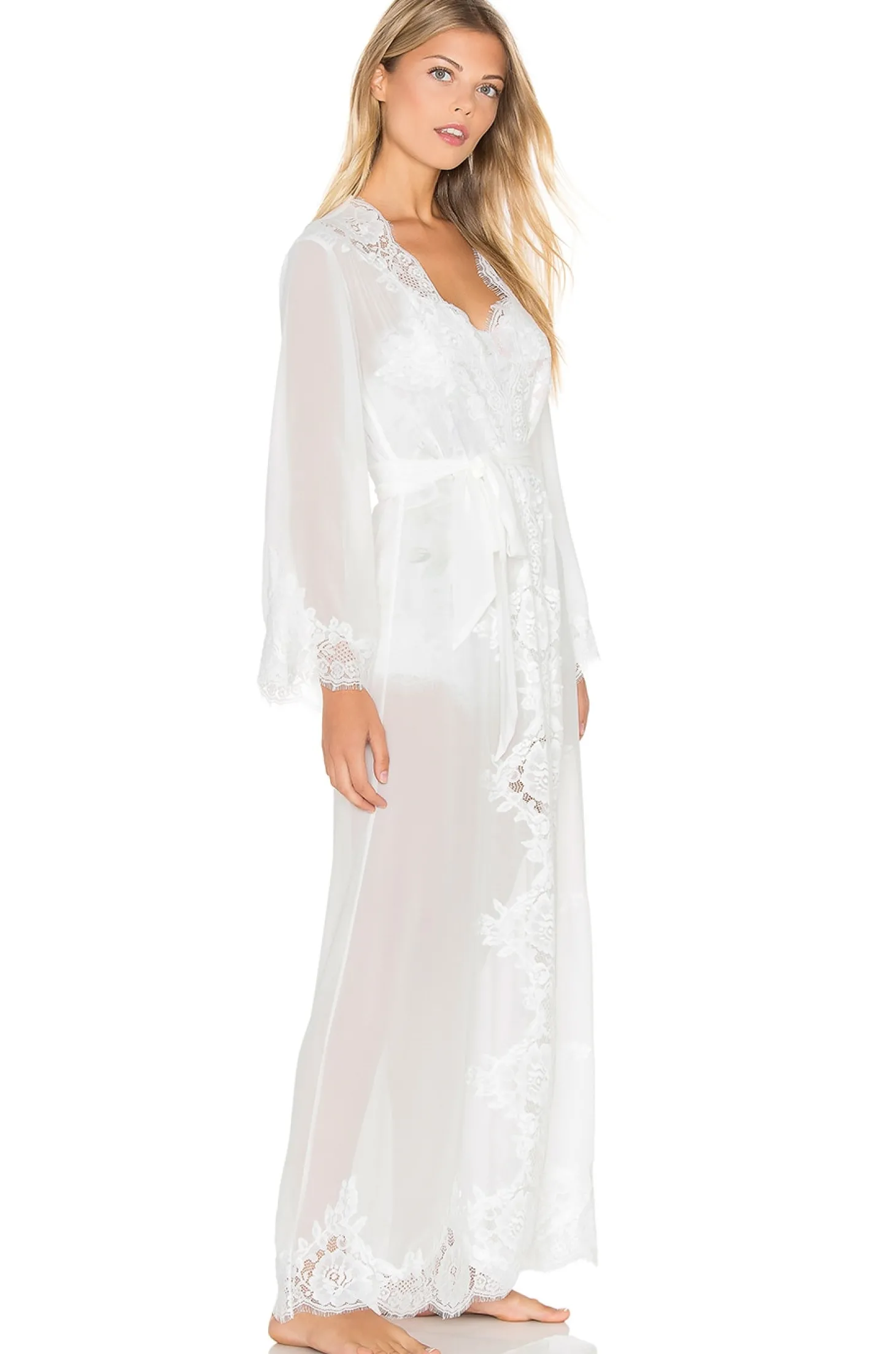 100% poly.Open front.Contrast lace trim.Belted waist tie