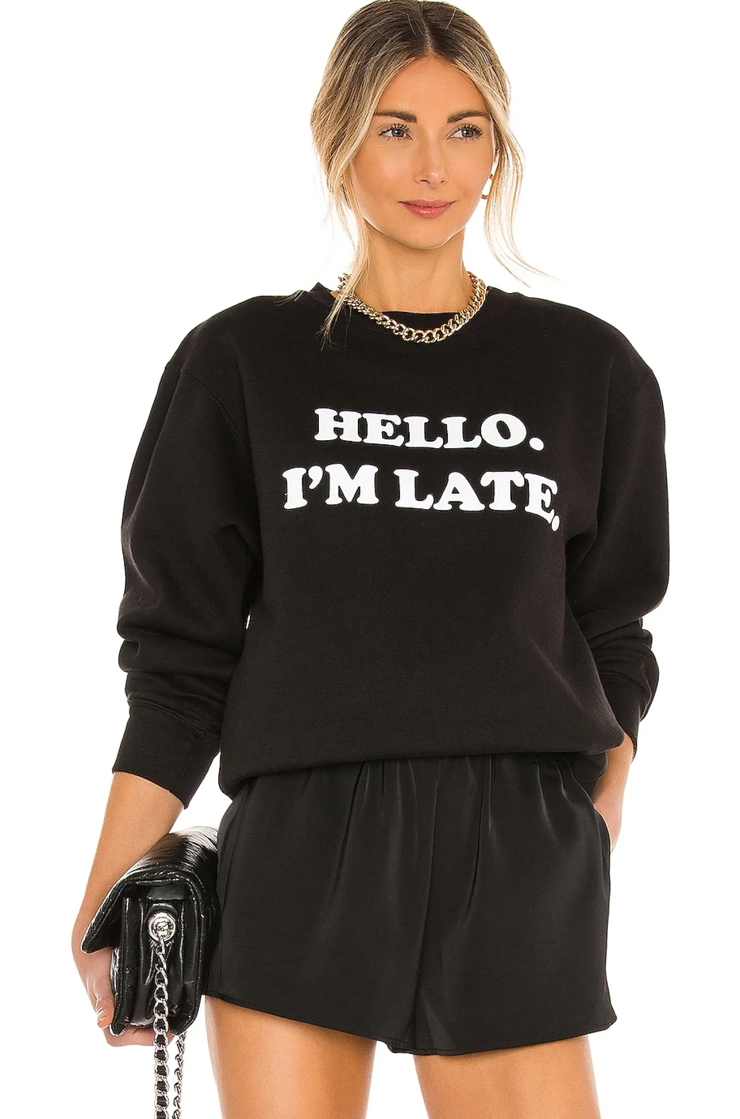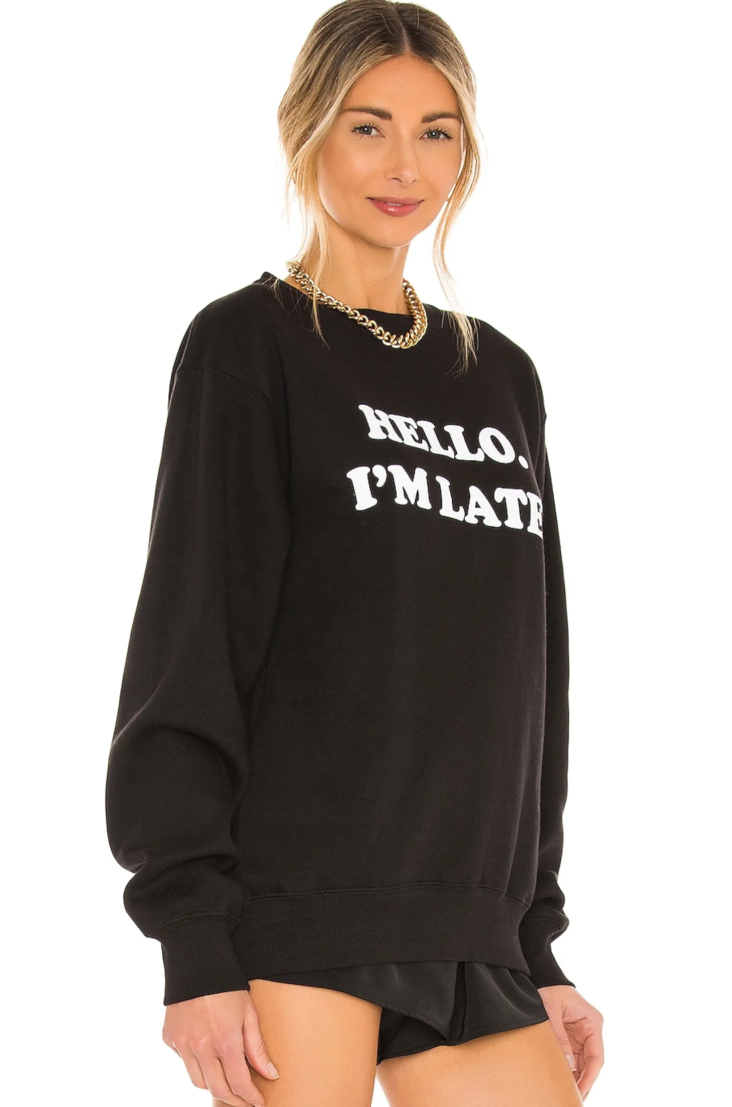"Hello. I'm Late.".70% cotton 30% poly.Crewneck.Screen print graphic.Rib trim.Fleece lining.Relaxed fit.Imported.Elevate your style with DEPARTURE Hello I'm Late Sweatshirt: comfy yet chic. Pair with shorts for an off-duty model vibe.