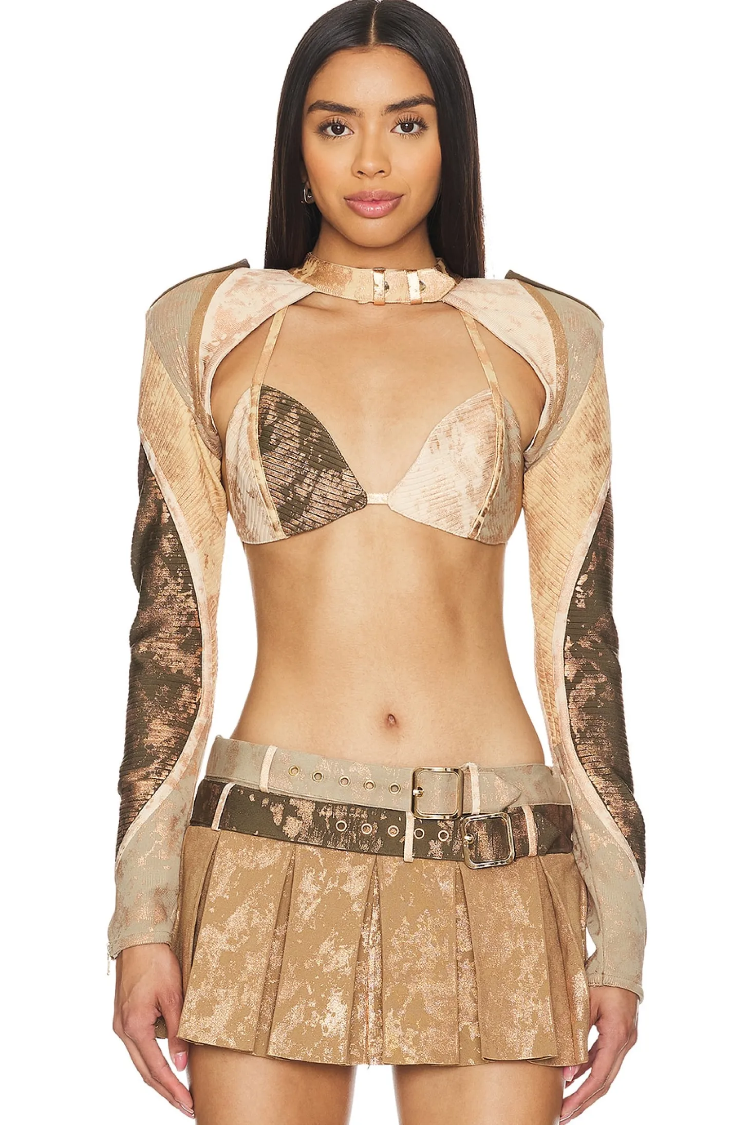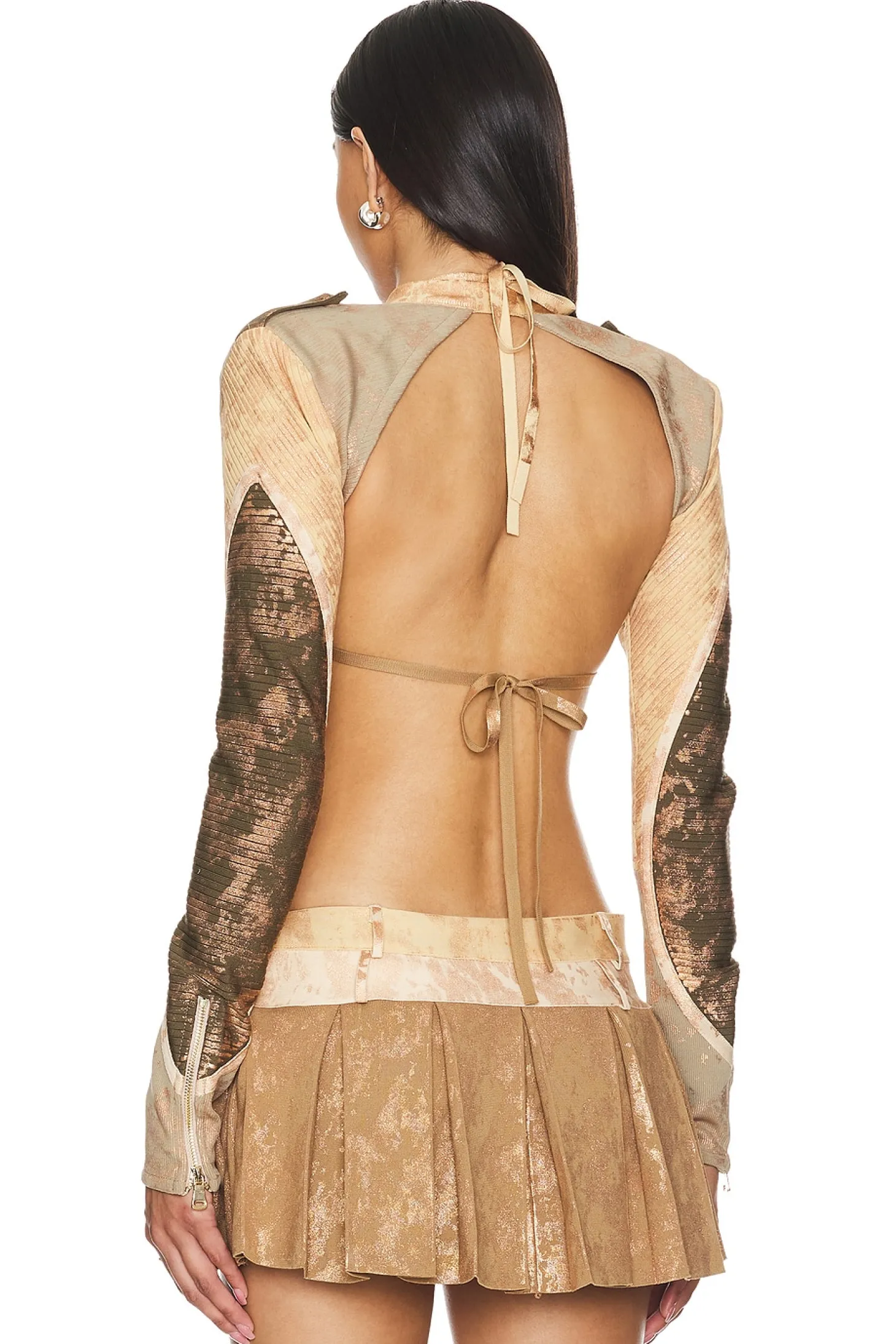 100% polyester.Made in China.Dry clean.Neck snap button closure.Attached shoulder pads