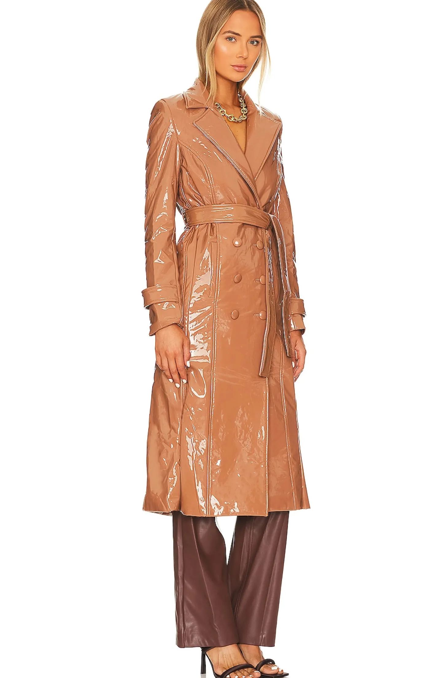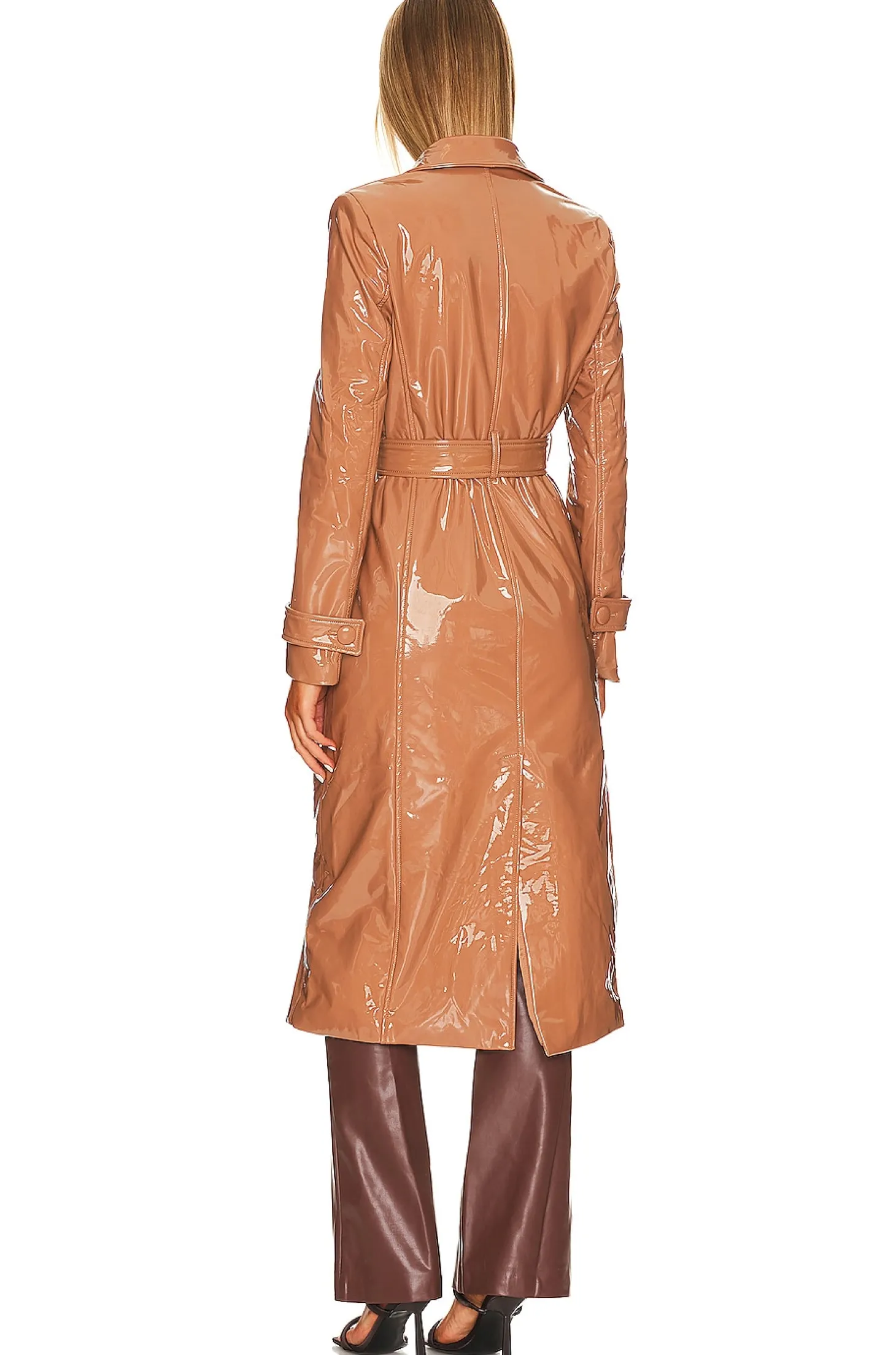 Self: 100% polyurethane Lining: 95% polyester 5% elastane.Made in China.Dry clean only.Front button closure.Side slip pockets.Detachable waist tie.Button cuffs.Lightweight patent faux leather fabric