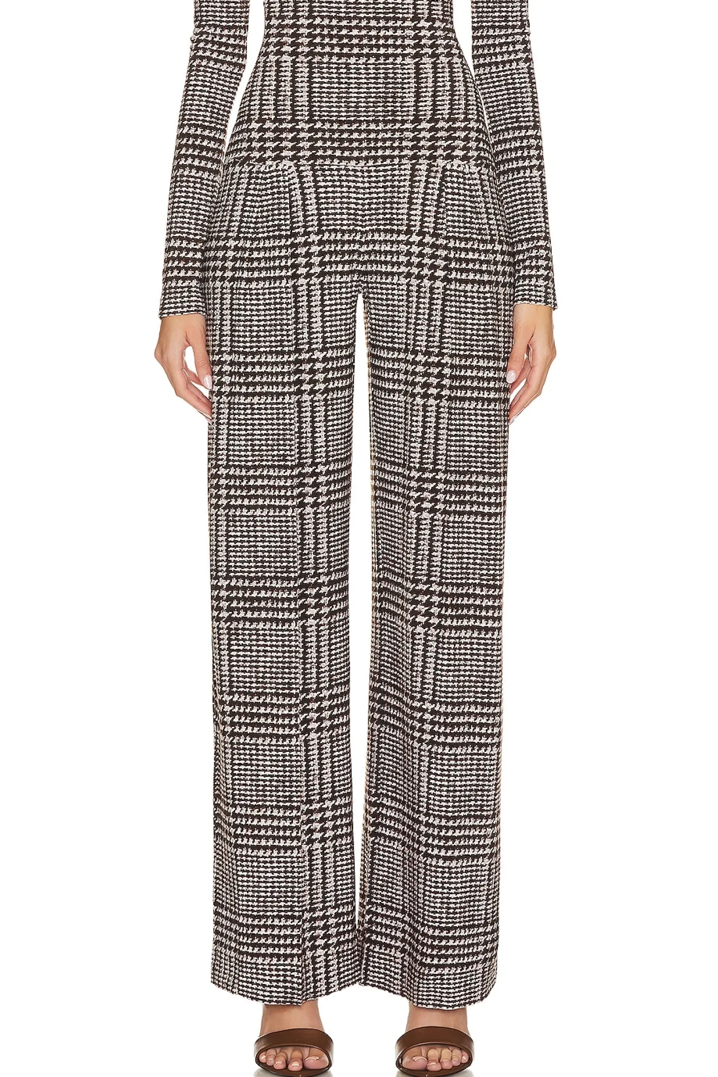Step into autumn with style in Norma Kamali's Chocolate Glenn Plaid Tweed High Waist Pleat Pant. These high-waisted, wide-leg pants are the perfect essential for a chic fall wardrobe, just in time for pumpkin season..95% polyester 5% spandex.Made in China.Machine wash.Pull-on styling with wide stretch waistband.Lightweight slinky jersey fabric.Item not sold as a set.23" at the knee and 23" at the leg opening.style runs large, size down