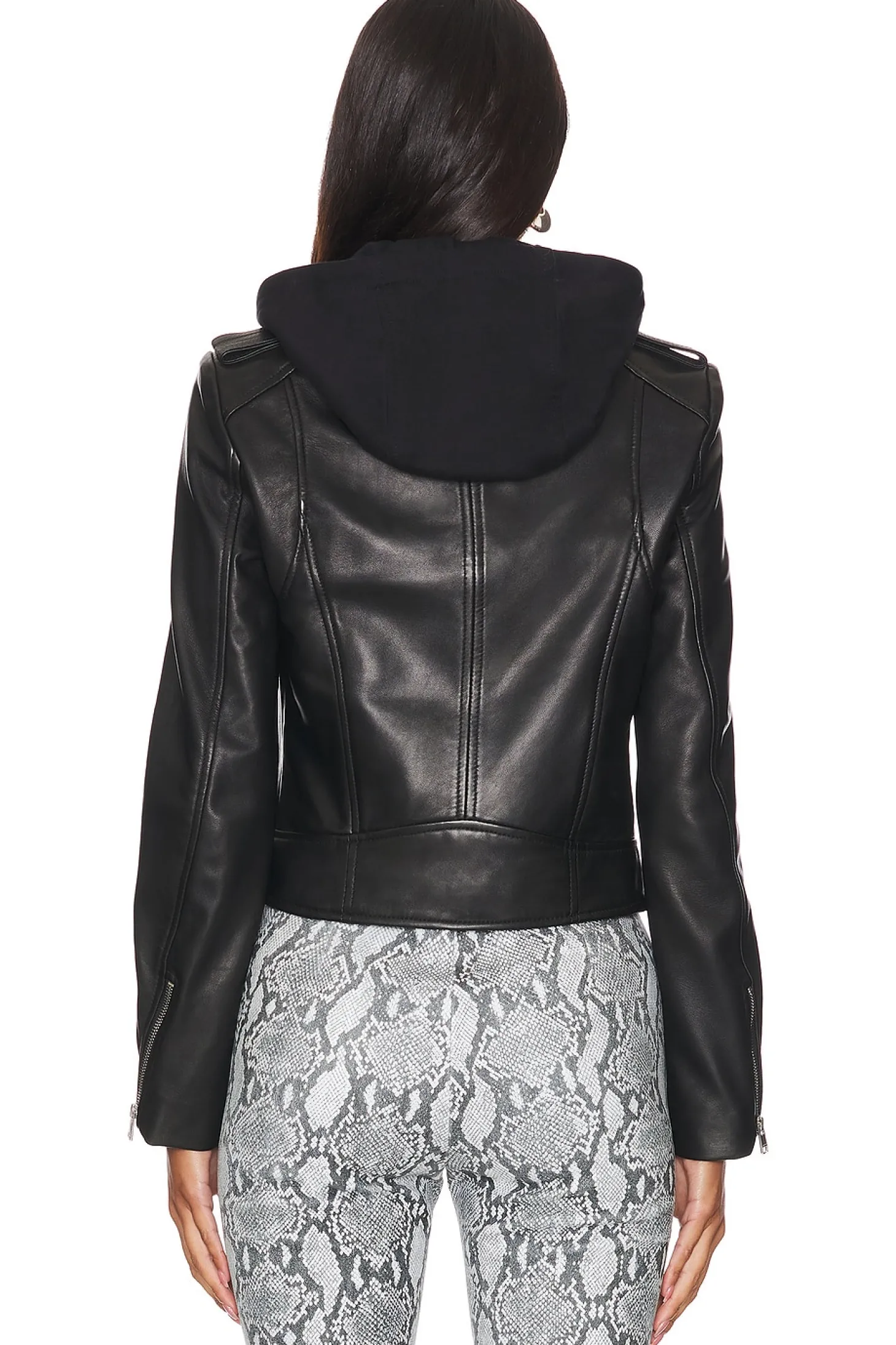 Self 1: 100% lamb leather Self 2: 100% cotton Lining: 97% polyester 3% spandex.Made in India.Dry clean recommended.Front zipper closure.Side zipper pockets.Zipper cuffs.Leather with detachable jersey hood