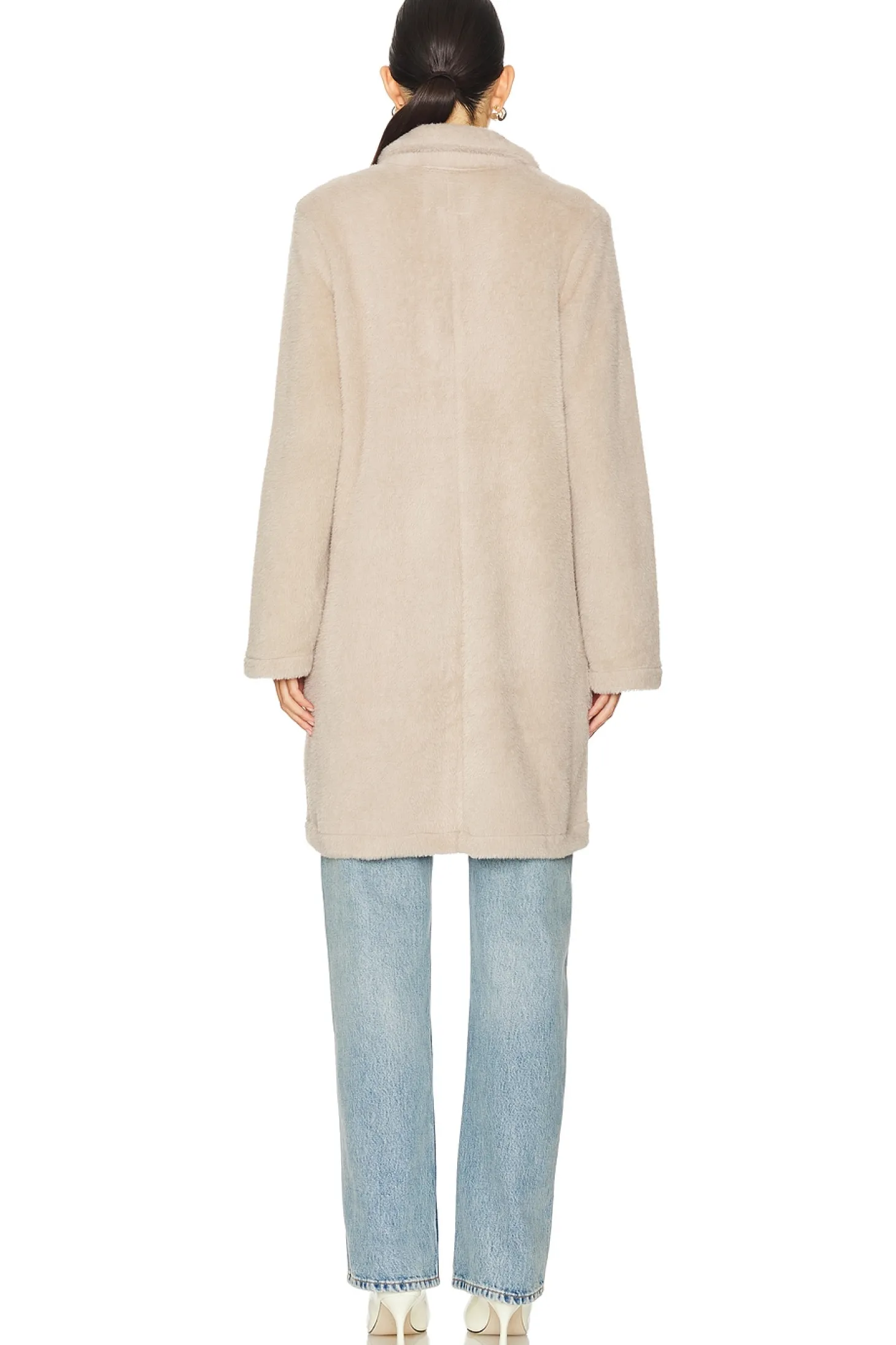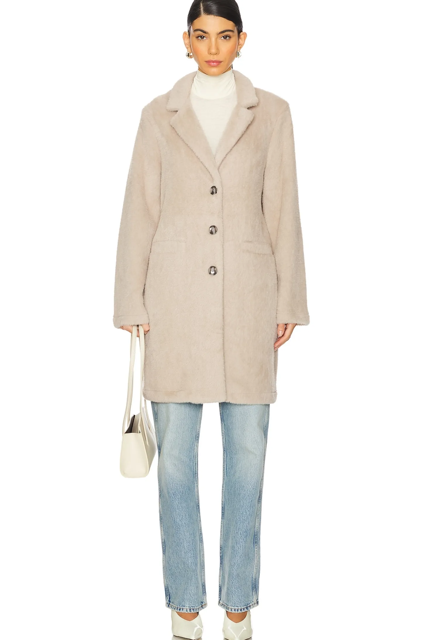 Self: Faux Fur: 64% nylon 36% polyester Contrast Fabric: 100% rayon.Made in China.Machine wash.Single breasted closure.Front slip pockets.Faux fur exterior
