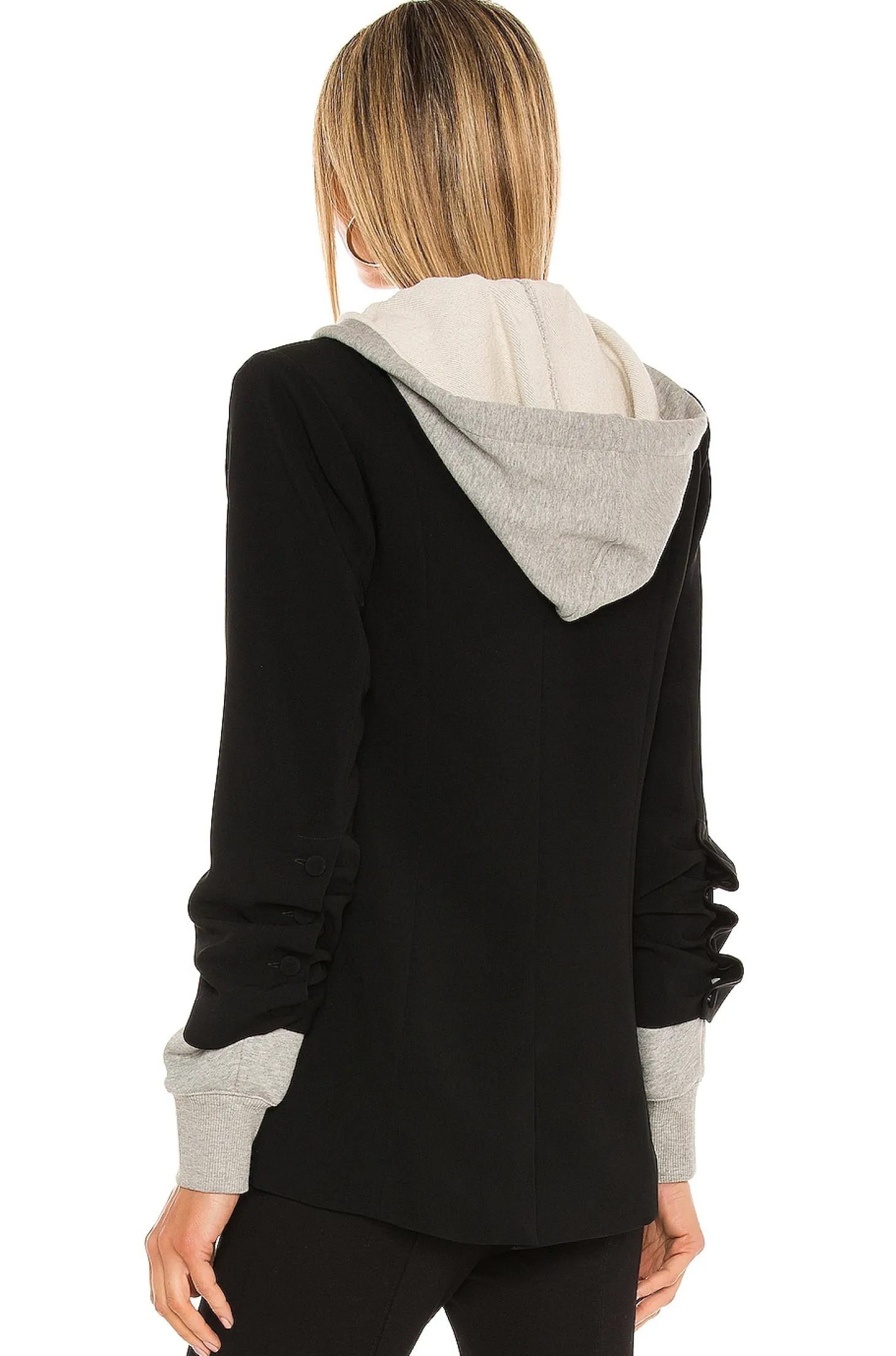 Shell: 69% triacetate 31% polyester Combo:95% cotton 5%polyester Lining: 100% polyester .Made in China.Dry clean only.Front button closure.Front slip pockets and lightly padded shoulders.Attached drawstring hood.Ruched sleeves with button closures and ribbed cuffs.Back vent