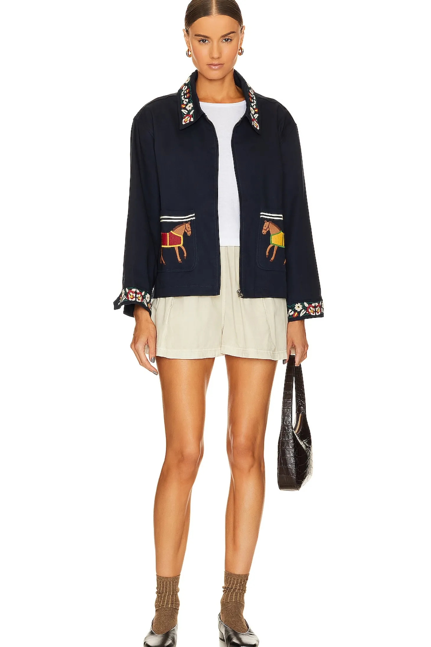 100% cotton.Made in China.Machine wash.Front zipper closure with button cuffs.Front slip pockets.Twill fabric with embroidered graphics