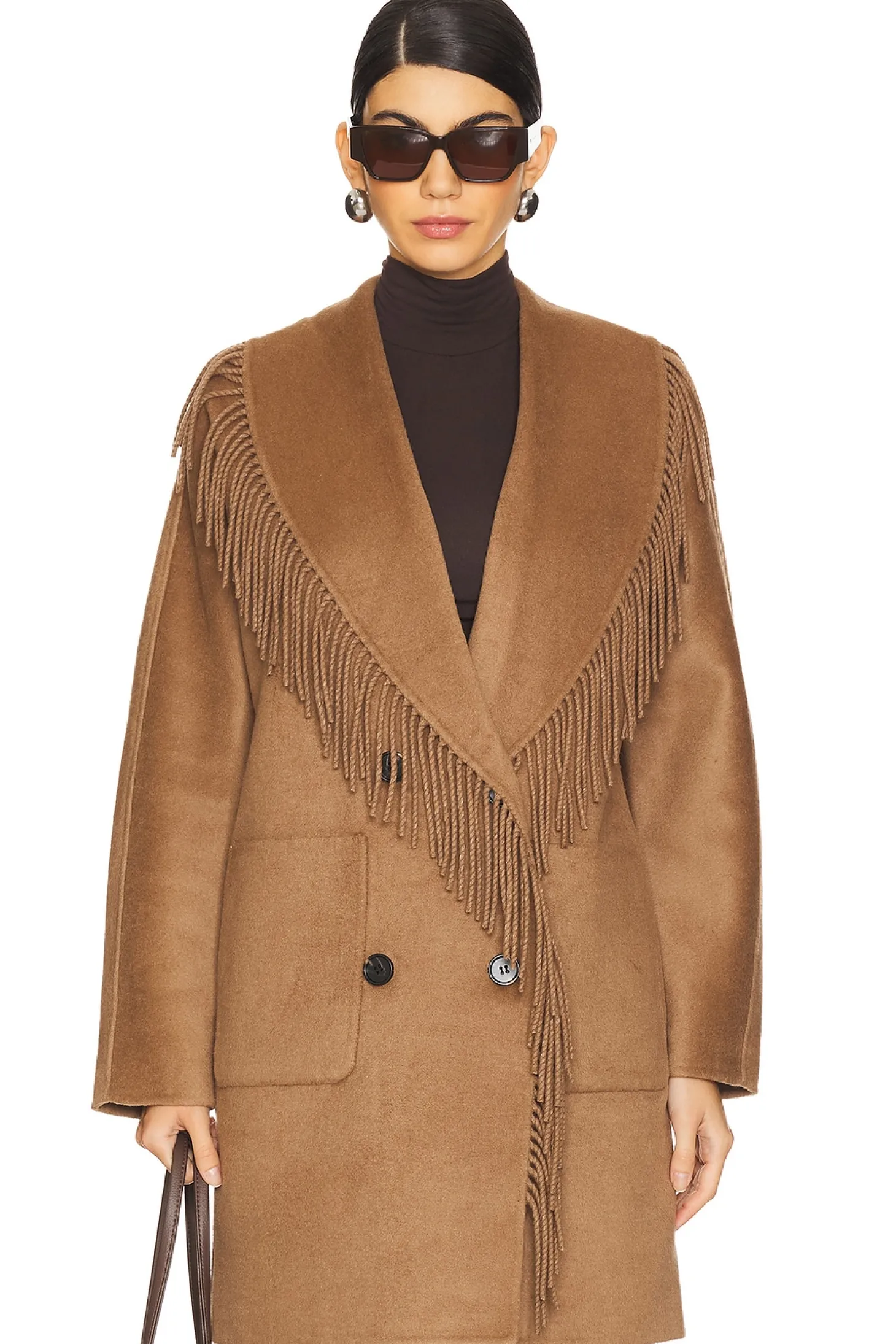 51% wool 49% polyester.Made in China.Dry clean only.Front button closure.Front slip pockets Fringed neckline.Heavyweight twill fabric