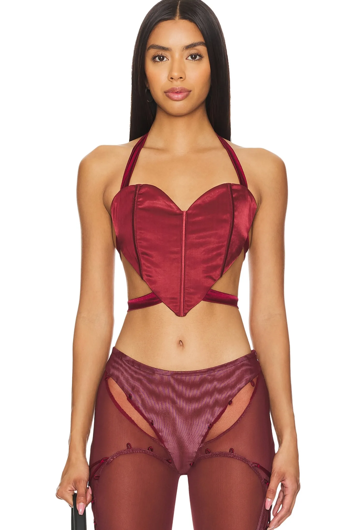 Self: 95% viscose 5% spandex Trims: 100% polyester.Made in Indonesia.Hand wash.Satin halterneck and back ties.Boned bodice.Satin fabric