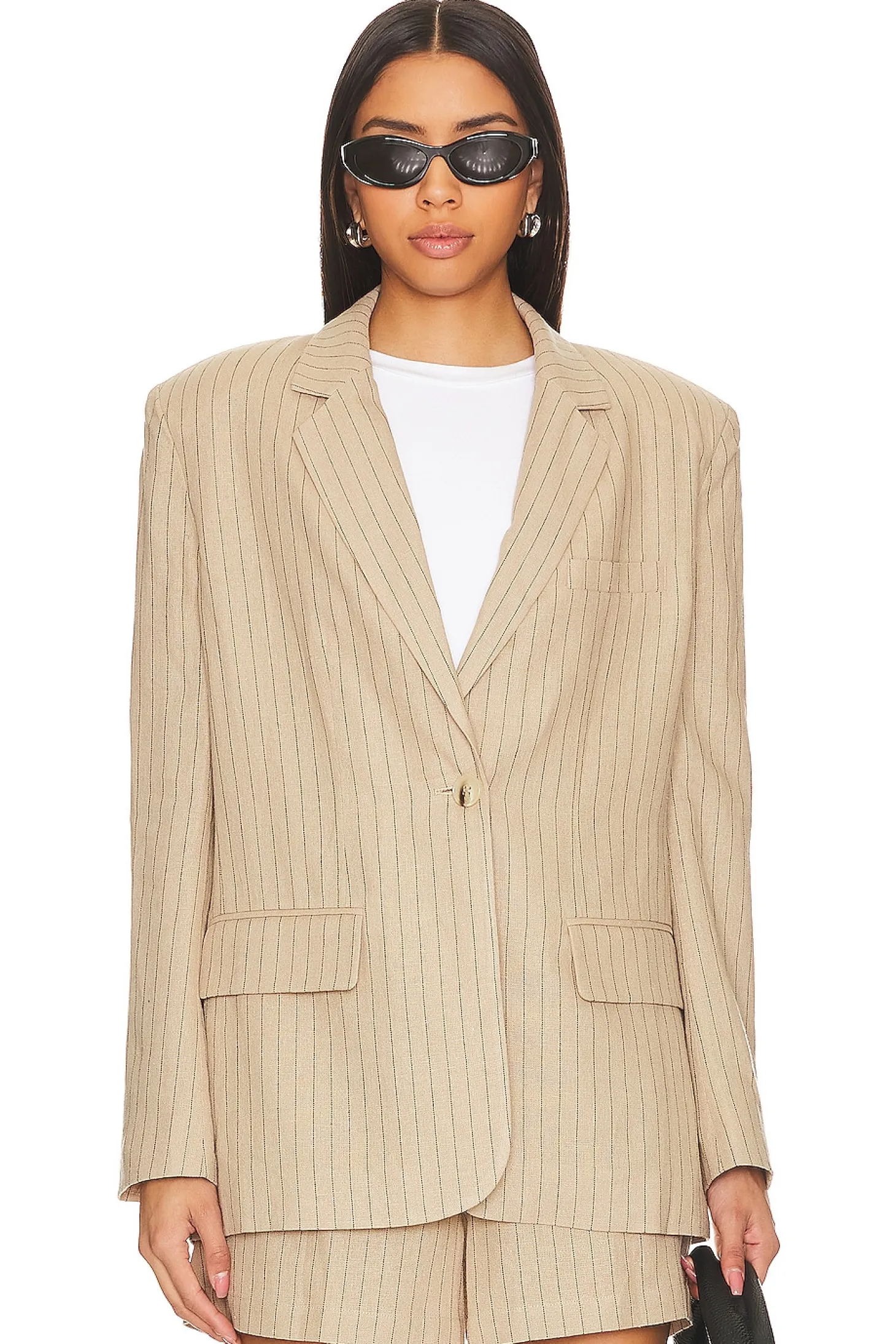 Self: 52% linen 48% viscose Lining: 100% polyester.Made in China.Hand wash.Singular front button closure.Padded shoulders.Front welt pockets.Lightweight linen fabric.Item not sold as a set