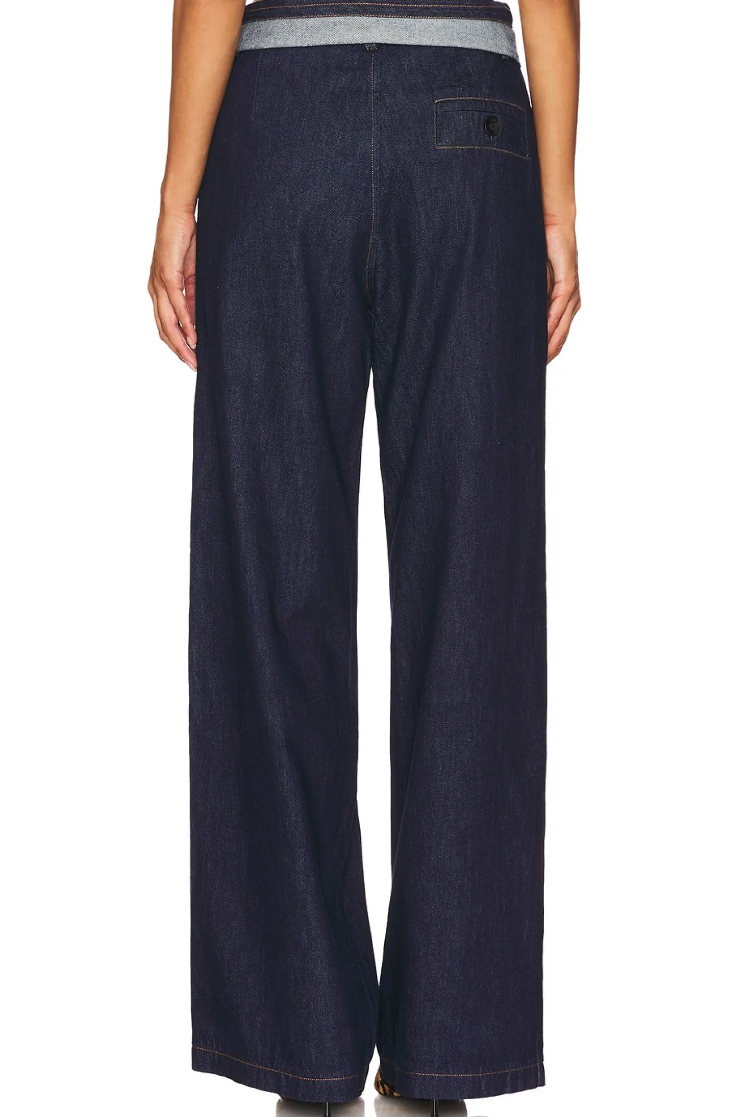 Self: 100% linen Lining: 100% cotton.Made in China.Dry clean only.Zip fly and button closure.Slant pockets with single rear pocket.Foldover waistline.Lightweight denim.23" at the knee narrows to 22" at the leg opening