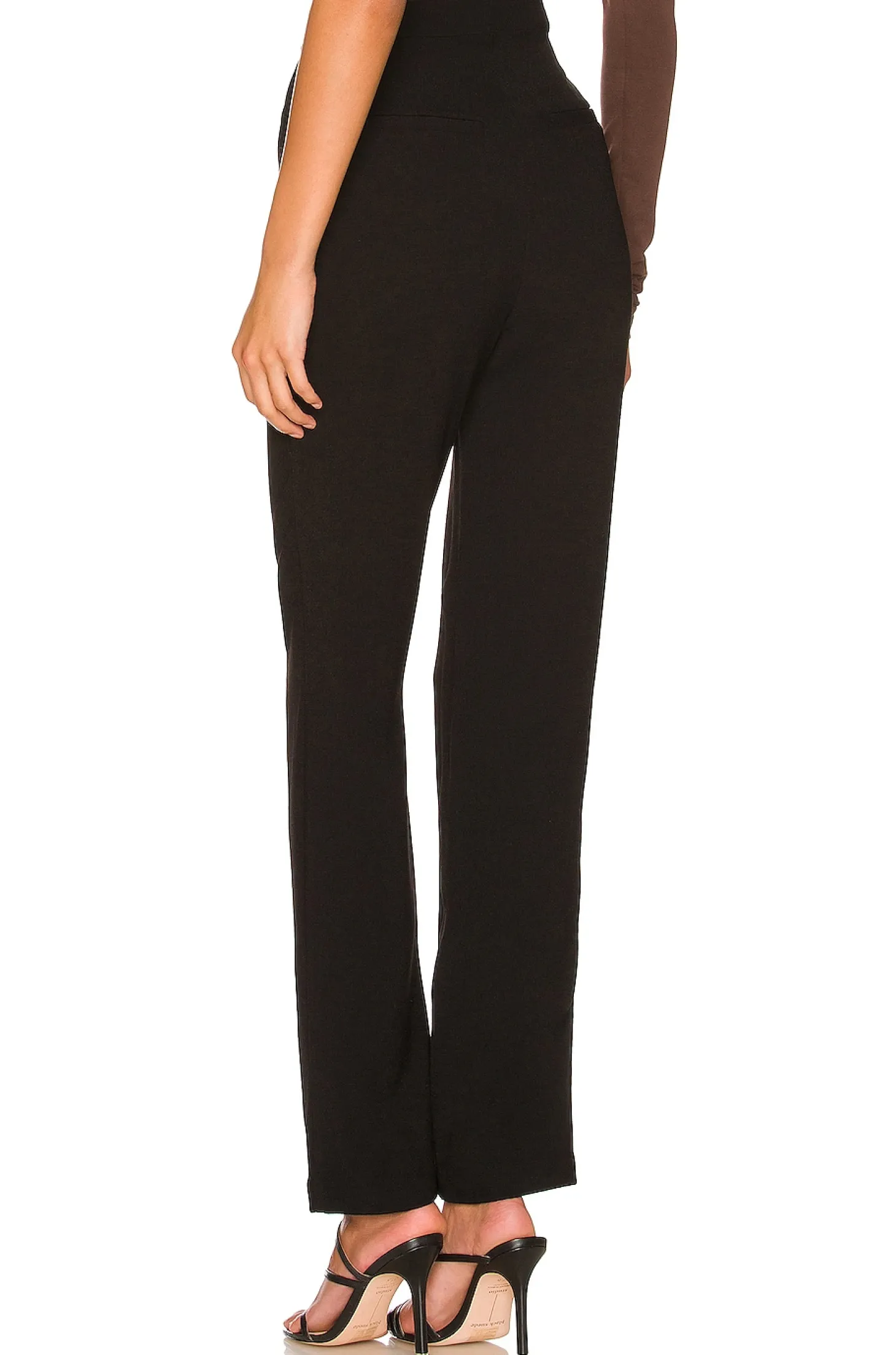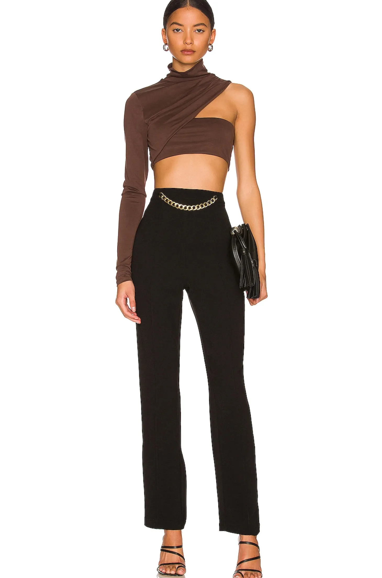 95% poly 5% elastane.Made in China.Hand wash.Hidden side zipper closure.Faux back slip pockets.Attached gold-tone chainlink accent.Crepe fabric with pintuck detail at front.16" at the knee narrows to 12.5" at the leg opening