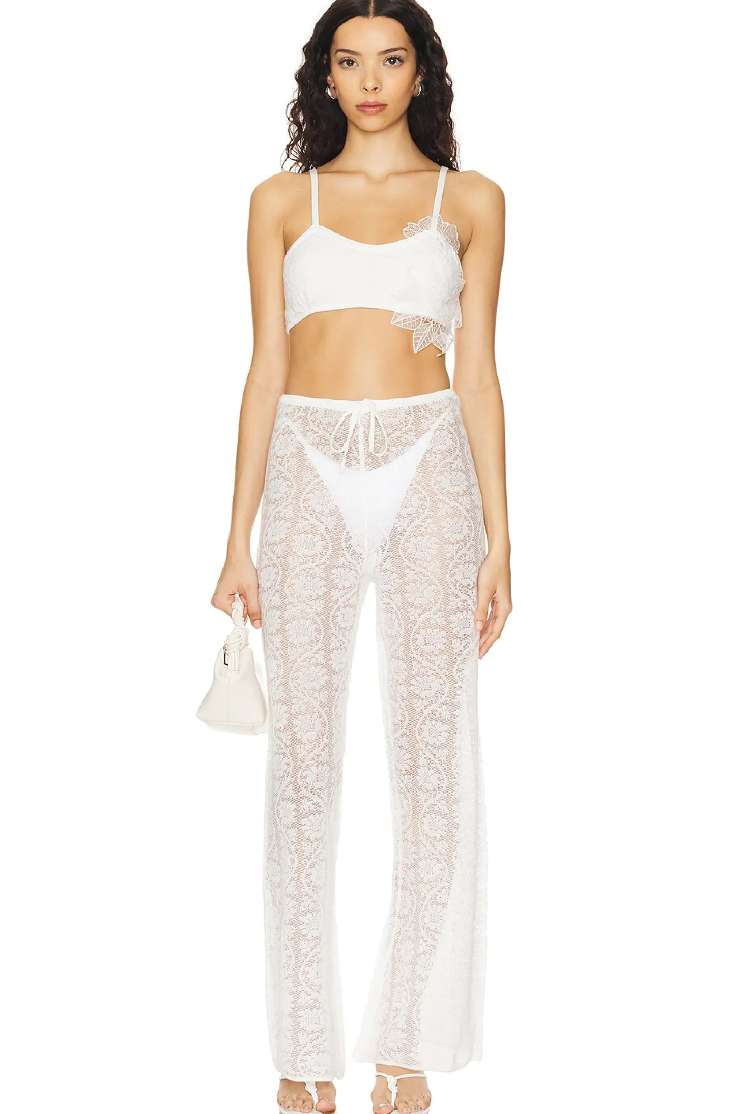 Self 1: 100% cotton Self 2: 100% polyester.Made in China.Hand wash.Pull-on styling with drawstring at waist.Garment is intentionally sheer, undergarments will show through. Please note undergarment not included.20" at the knee breaks to 24" at the leg opening