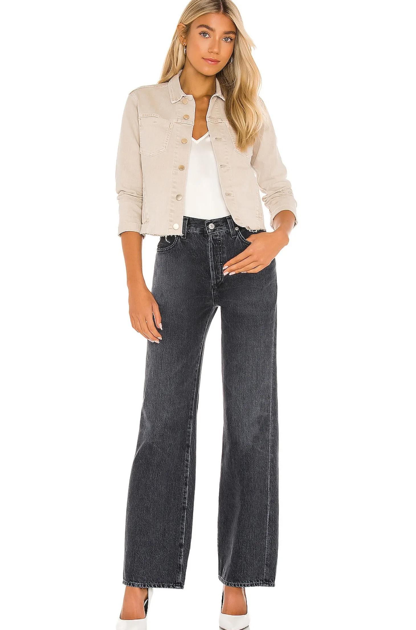98% cotton 2% spandex.Light fading and distressed detail.Front button closure.Breast pockets and side welt pockets.Raw cut cuffed sleeves.Raw cut hem.Made in USA