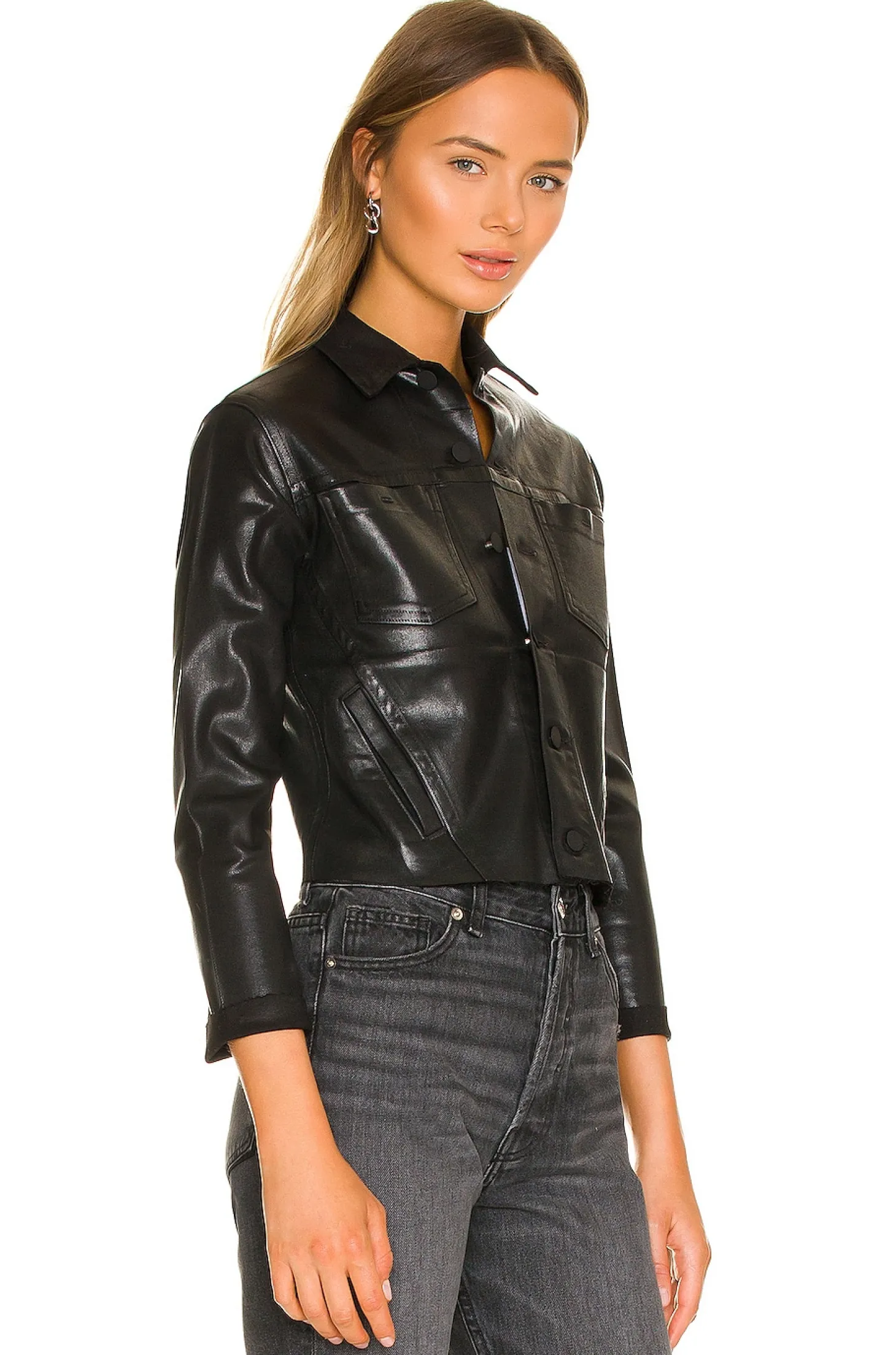 88% cotton 11% poly 1% spandex.Made in USA.Spot clean.Front button closure.Front patch and side welt pockets.Rolled, raw-cut cuffs.Raw-cut hem.Coated denim fabric
