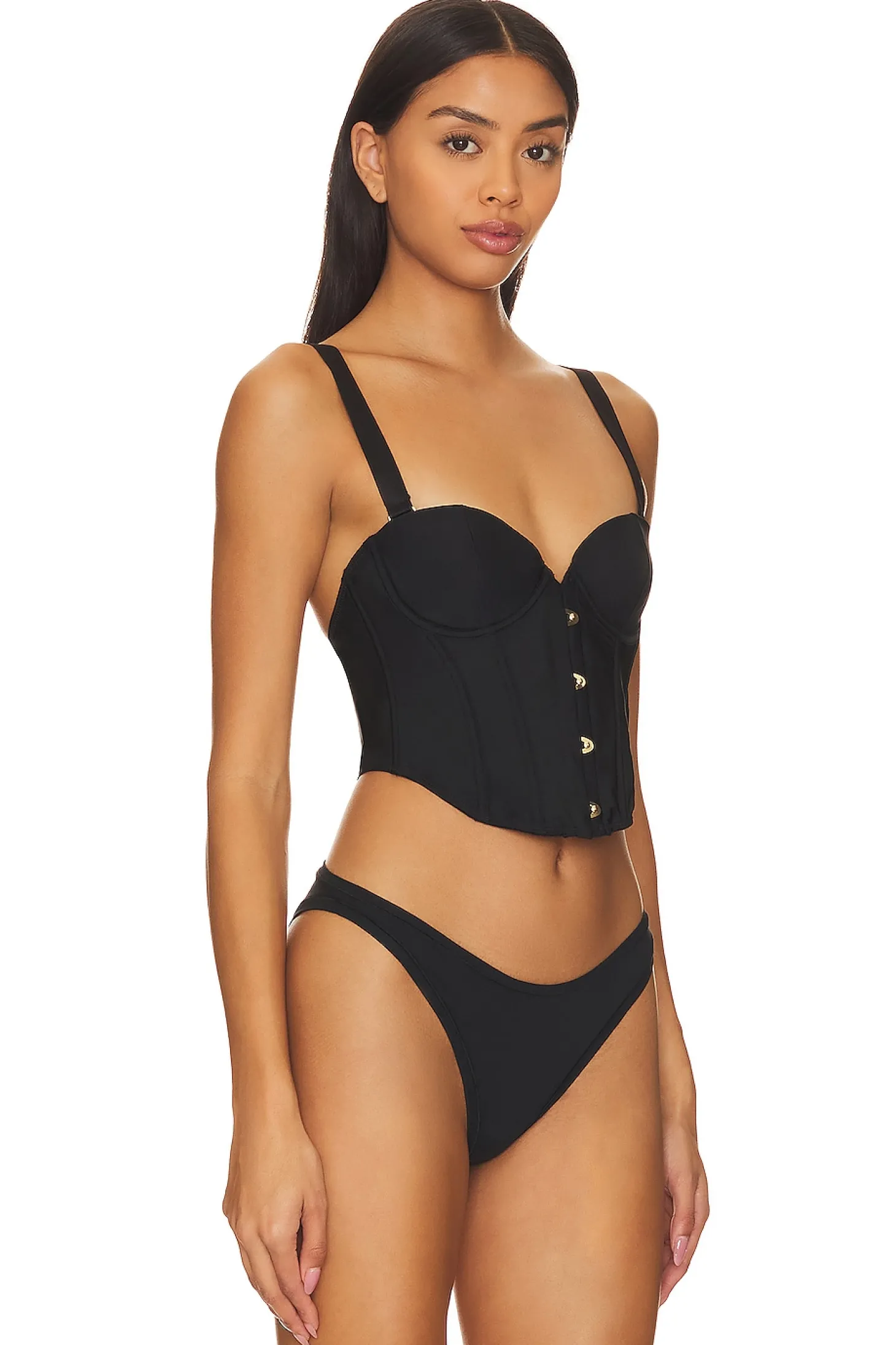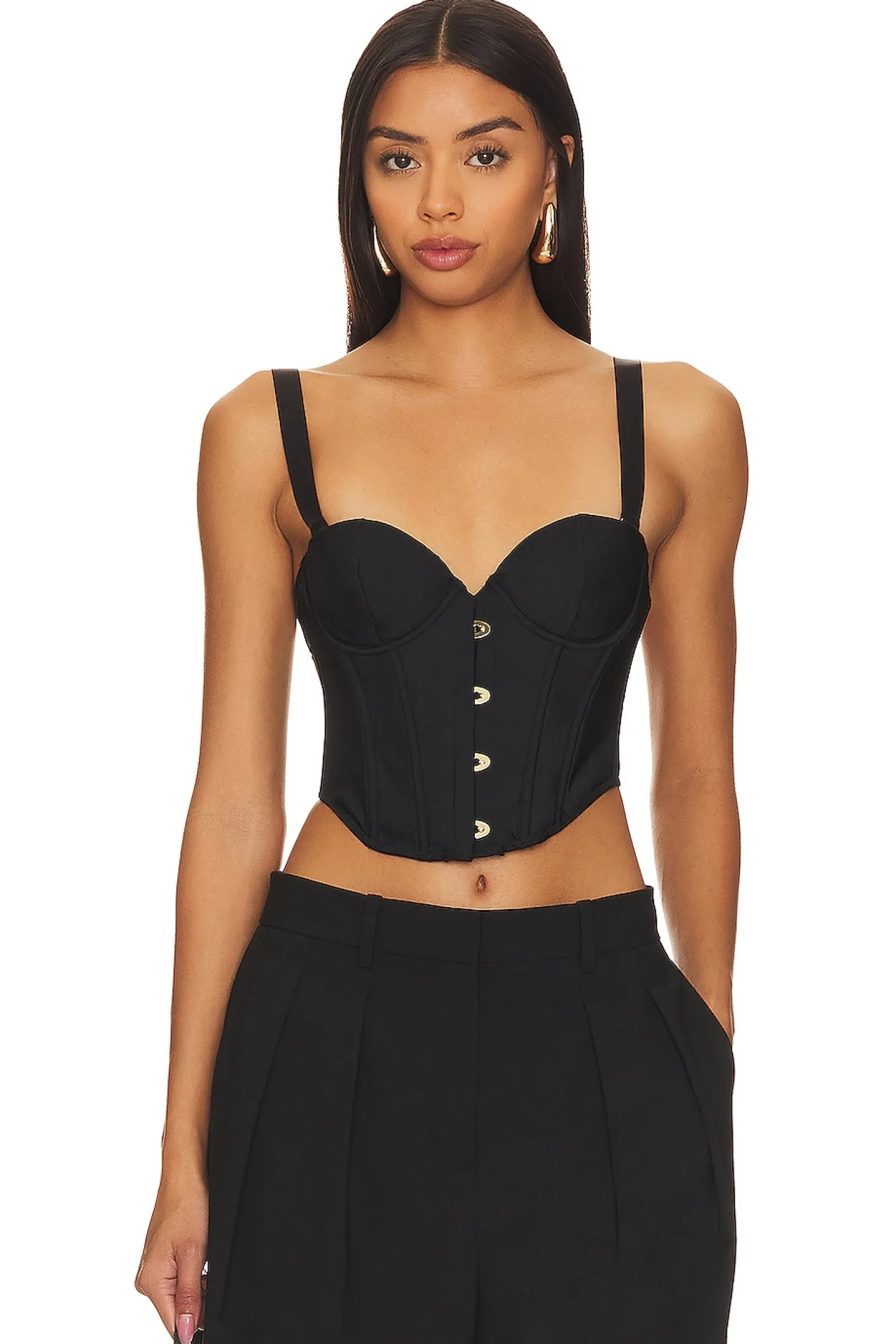 Self 1: 100% polyester Self 2: 100% polyamide.Made in China.Hand wash.Lightly padded underwire cups.Back hook and eye closure.Front hook and button pin closure Boned bodice.Detachable and adjustable shoulder straps.Crepe jersey fabric