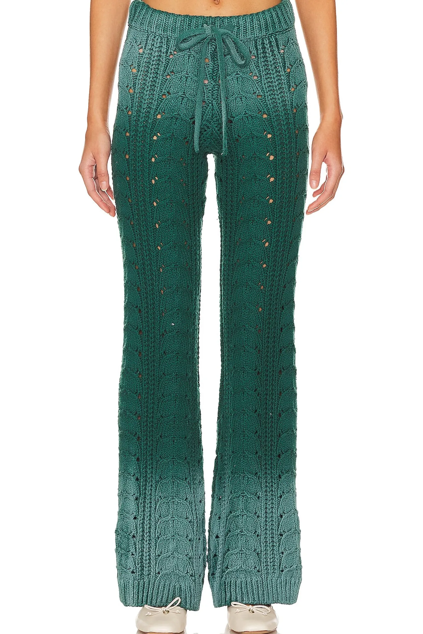 Ignite your free-spirit style with Lovers and Friends Jelissa Ombre Knit Pant in Green Ombre. Crafted from dyed open knit fabric, this sweater is a burst of color for everyday wear. Elevate your casual style with this vibrant and effortlessly stylish piece..98% cotton 2% nylon.Made in China.Hand wash.Elastic drawstring waist tie closure.Open knit fabric.Item not sold as set.18" at the knee breaks to 22" at the leg opening