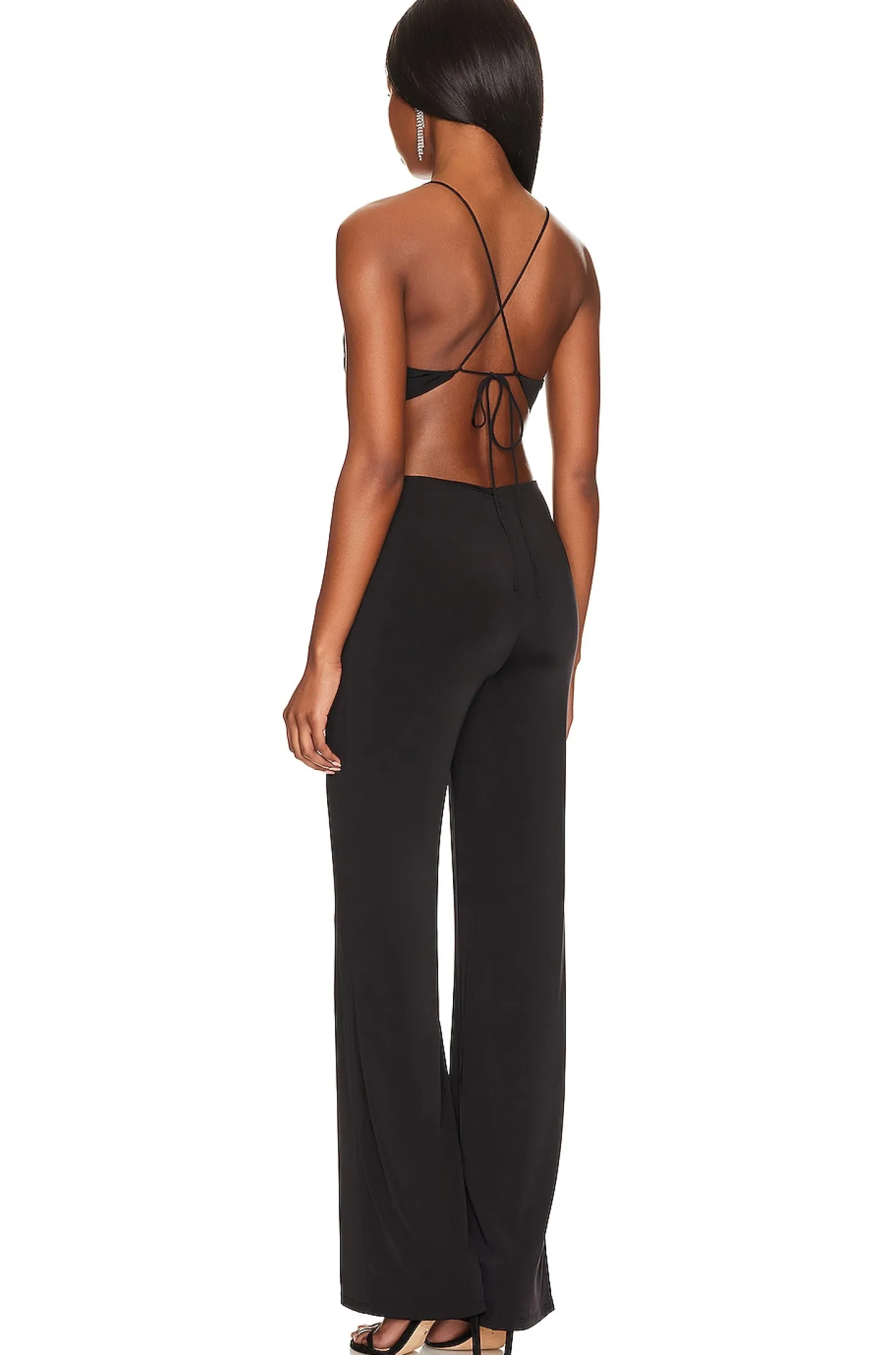 93% polyester 7% elastane.Made in China.Hand wash.Pull-on styling.Crisscross back tie closure.Plunging neckline.Side and back cut-outs Slinky jersey fabric